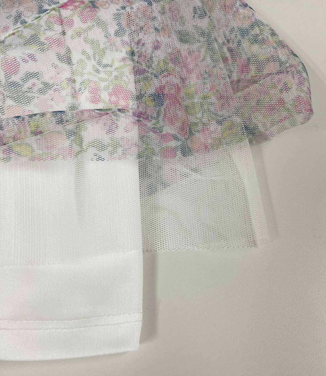 上がデニムで下が花柄チュール、ベルト付きのワンピースです。