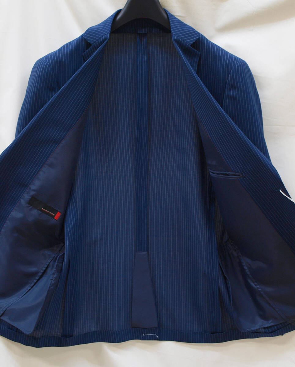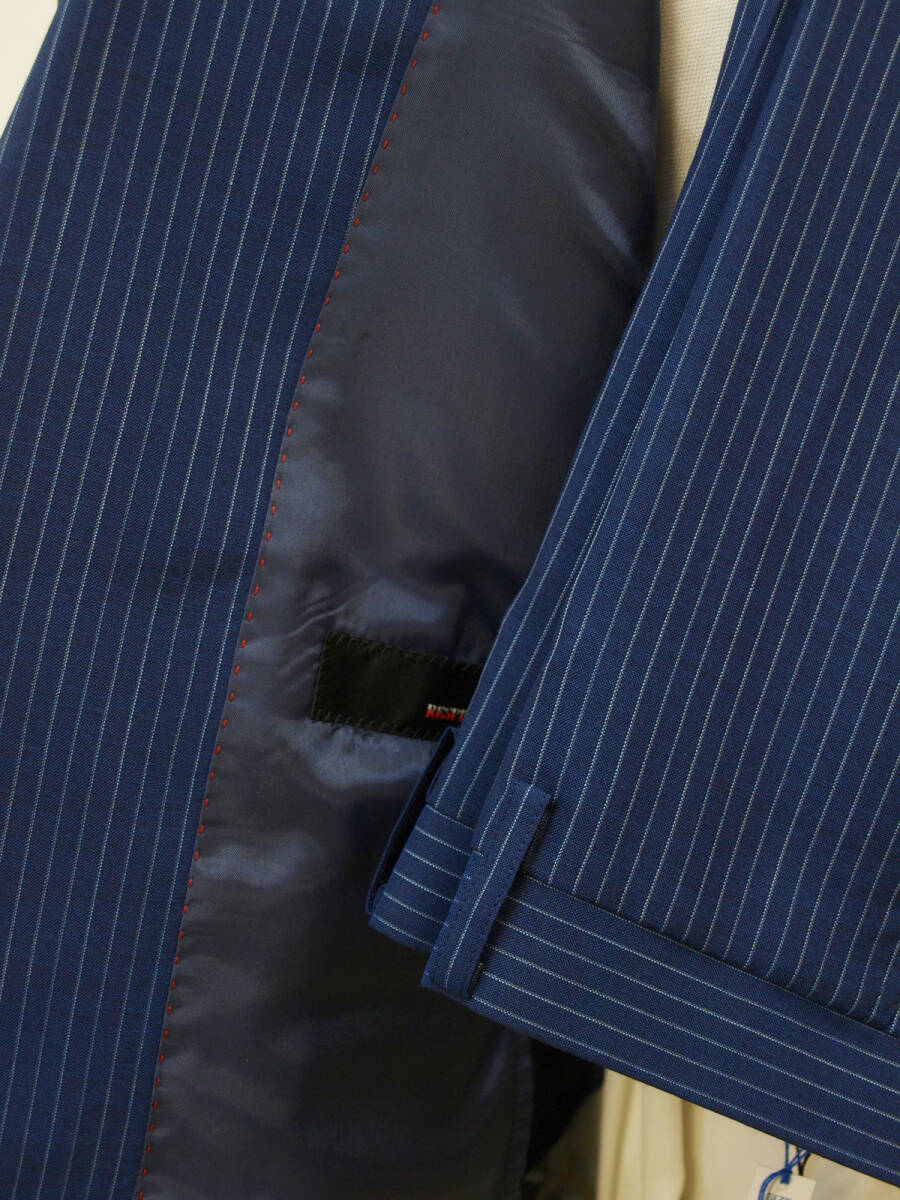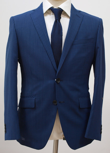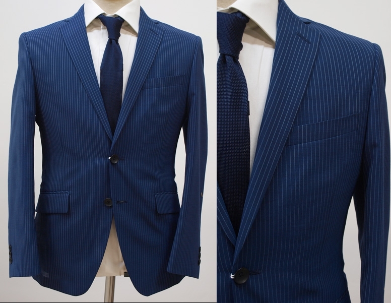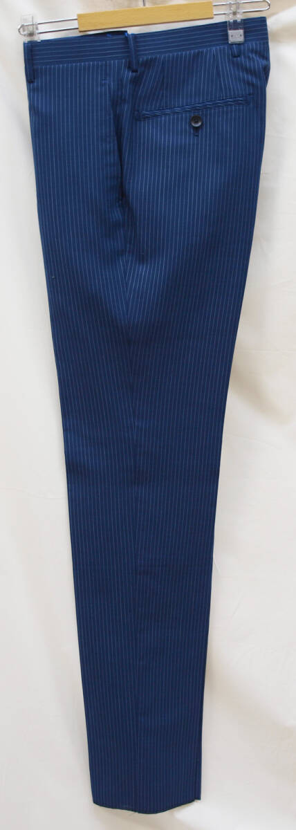 【サイズ】 A7(ALL号サイズ相当) 目安の体型 身長175cm~185cm、ウエストサイズ86cm前後 【ジャケット実寸】 肩幅45cm 着丈72cm 袖丈63cm 脇下部分51cm 身幅46cm 【パンツ実寸】 ウエスト(胴回り実寸)84cm (平置きでかるくはかると84cmでひっぱってはかると86cmです。) わたり幅33cm(股下10cmの部位で29.5cm) 裾幅19.2cm 脇股上24.5cm 前股上27cm 股下92cm(裾上げ未処理の状態/新品) 【素材】 表地:ウール50% ポリエステル50% 裏地:胴裏/ポリエステル100% 袖裏/ポリエステル100% 春夏向け軽量清涼、盛夏対応紳士スーツ用、機能性薄手ウールブレンド生地を使用 【色】 明るめ紺色 【柄】 ストライプ ・春先~夏~秋にかけて春夏メインのシーズン対応商品です。 【デザイン】 コンパクトな印象の細身ですっきりとしたシルエット、タイトフィットスリム、ビジネススーツ新品、裾上げしていない状態です。 ・ジャケット:シングル2つボタンで細身のスリムモデル、肩パットなし ・パンツ:細いシルエットのノータックスリムパンツ 【縫製仕様】 ・ジャケットはシングル2つボタン、ノッチドラペル、袖口ボタン3つ、センターベント、内ポケット1つ、背抜き(盛夏対応春夏物) ・パンツはノータック、膝裏当て付き、脇ポケット斜め付け、後ろポケット両玉縁で左のみボタン付き、フロントはファスナーでボタン&ホック仕様、うちかけけボタン有り きちんとしたビジネス仕様の縫製仕立てで仕上がっております。