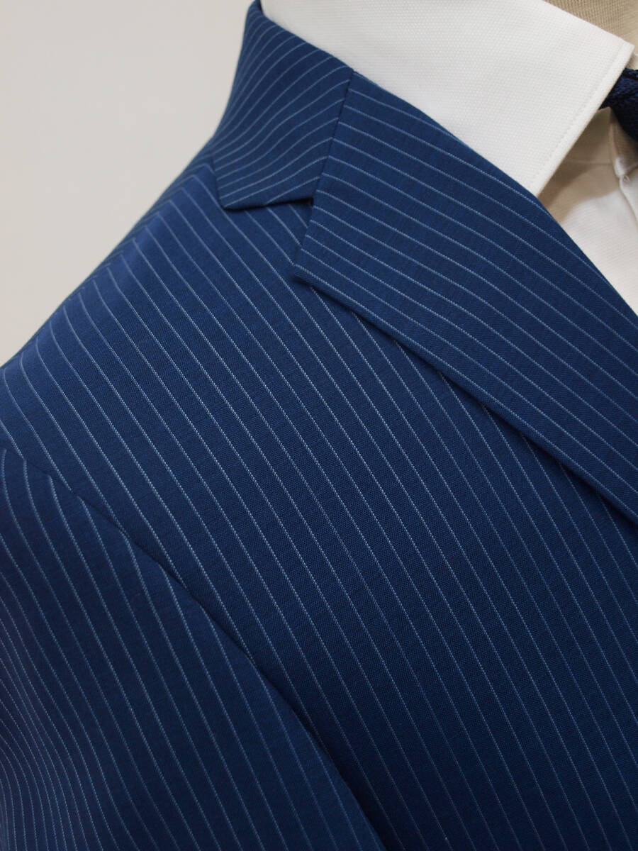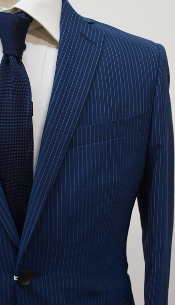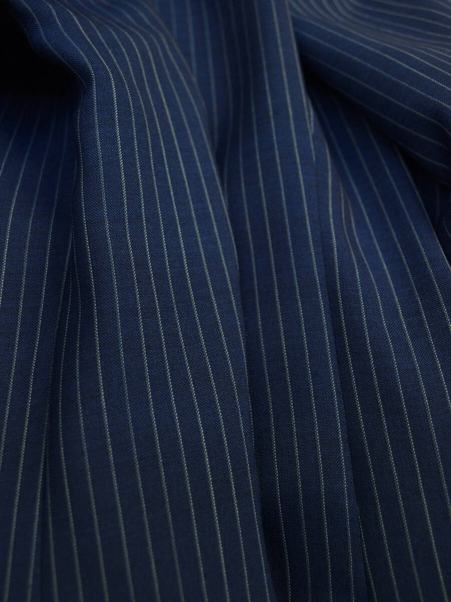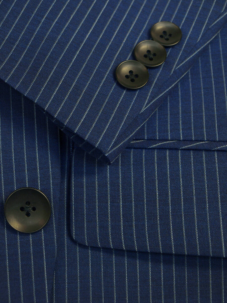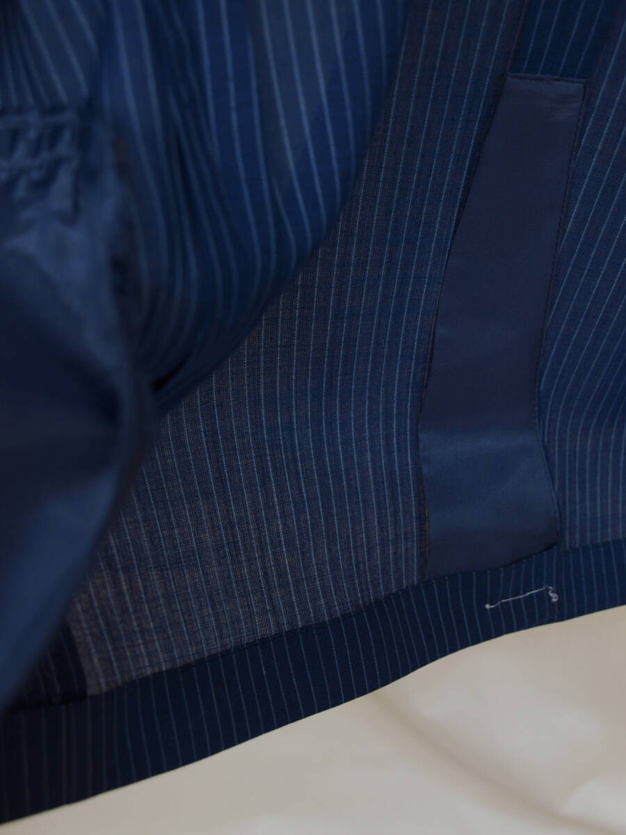 【サイズ】 A7(ALL号サイズ相当) 目安の体型 身長175cm~185cm、ウエストサイズ86cm前後 【ジャケット実寸】 肩幅45cm 着丈72cm 袖丈63cm 脇下部分51cm 身幅46cm 【パンツ実寸】 ウエスト(胴回り実寸)84cm (平置きでかるくはかると84cmでひっぱってはかると86cmです。) わたり幅33cm(股下10cmの部位で29.5cm) 裾幅19.2cm 脇股上24.5cm 前股上27cm 股下92cm(裾上げ未処理の状態/新品) 【素材】 表地:ウール50% ポリエステル50% 裏地:胴裏/ポリエステル100% 袖裏/ポリエステル100% 春夏向け軽量清涼、盛夏対応紳士スーツ用、機能性薄手ウールブレンド生地を使用 【色】 明るめ紺色 【柄】 ストライプ ・春先~夏~秋にかけて春夏メインのシーズン対応商品です。 【デザイン】 コンパクトな印象の細身ですっきりとしたシルエット、タイトフィットスリム、ビジネススーツ新品、裾上げしていない状態です。 ・ジャケット:シングル2つボタンで細身のスリムモデル、肩パットなし ・パンツ:細いシルエットのノータックスリムパンツ 【縫製仕様】 ・ジャケットはシングル2つボタン、ノッチドラペル、袖口ボタン3つ、センターベント、内ポケット1つ、背抜き(盛夏対応春夏物) ・パンツはノータック、膝裏当て付き、脇ポケット斜め付け、後ろポケット両玉縁で左のみボタン付き、フロントはファスナーでボタン&ホック仕様、うちかけけボタン有り きちんとしたビジネス仕様の縫製仕立てで仕上がっております。
