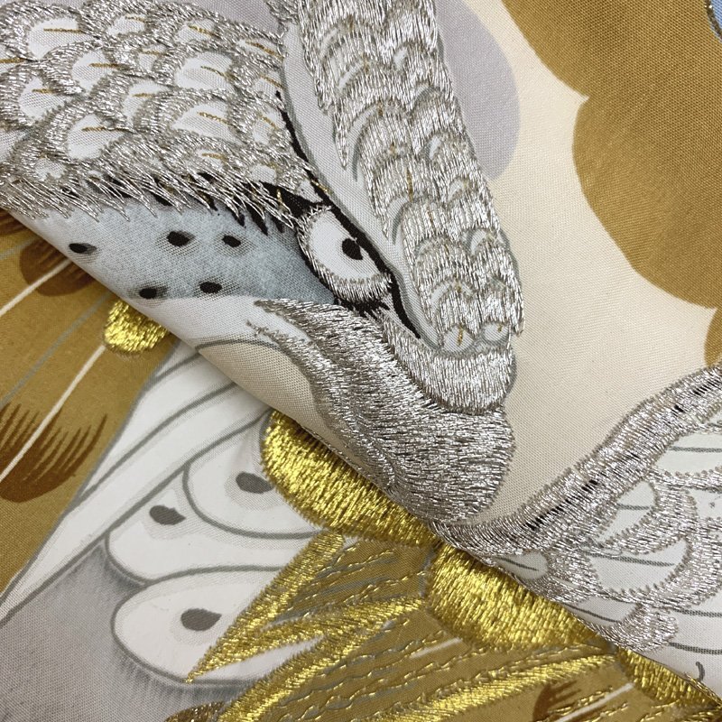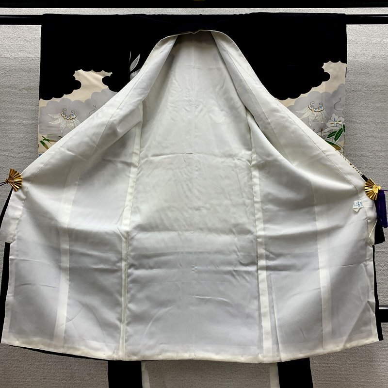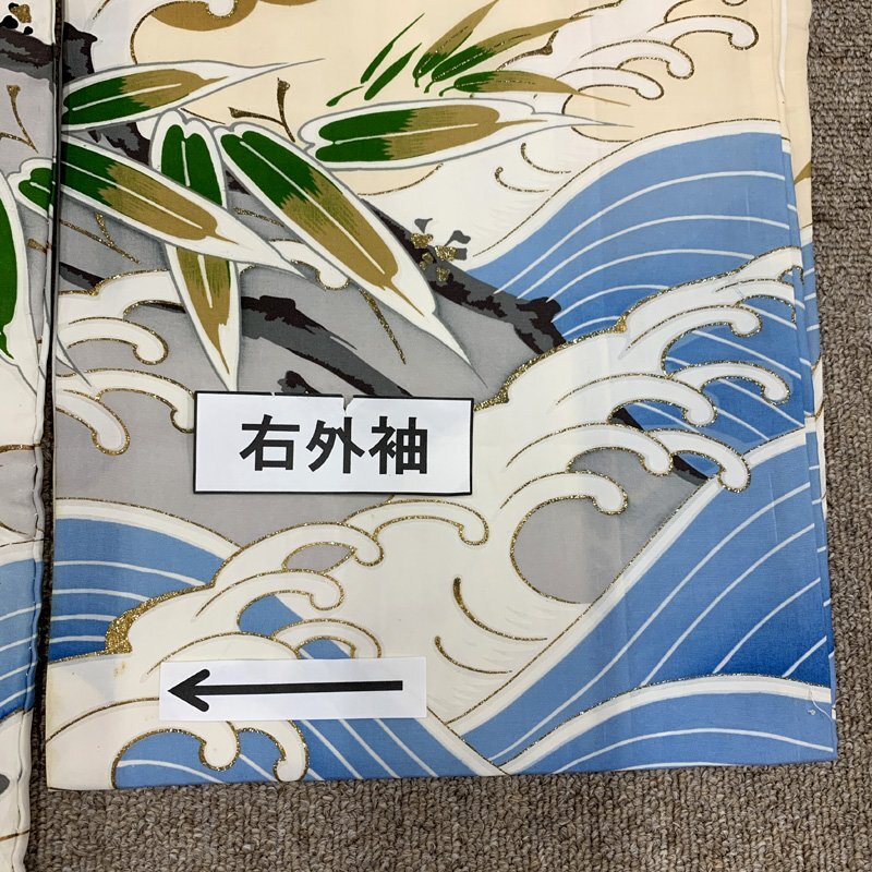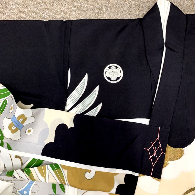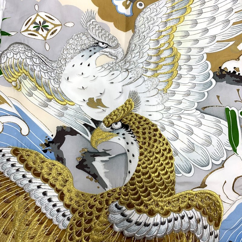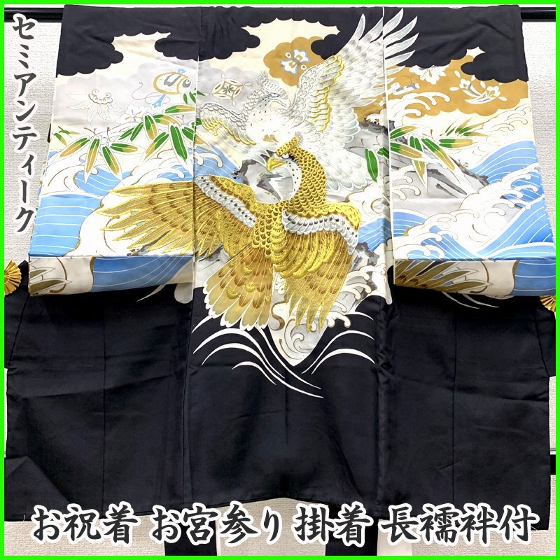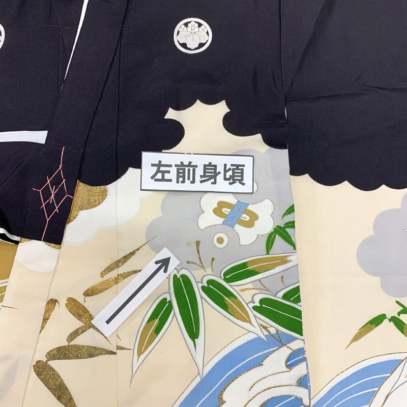 | □お宮参り セミアンティーク 男児 祝い着 着物 掛け着 長襦袢付 鷹 黒□良好 *こちらの商品は、長襦袢付きの掛け着です。人気のセミアンティーク。黒地に、金銀糸が施された二羽の雄々しい鷹が荒波の上を舞うお宮参り用の男の子のお祝い着です。五つ紋付きで、紋の種類は「丸に五山桐」です。 USED品で、右外袖、左前身頃の矢印部分に小シミがございますが着用時見えません。長襦袢はおまけでお付けしておりますが、ダメージがある場合もございますので、ご了承ください。 【表地素材】(着物)正絹 (長襦袢)ポリエステル 【色】黒 *モニターによって色味は実際と異なる場合がございます。 【サイズ】(着物) 裄:41cm、袖丈:56cm、身丈(肩から):94cm *素人採寸のため、多少の誤差はご容赦ください。 お宮参りの掛け着としてはもちろん、七五三の3歳のお着物としては、他に被布と草履などのお小物類を、5歳のお着物としては、他に羽織、袴、お小物類をご準備ください(肩上げ、腰上げは手縫いで簡単にできます) 。 | |