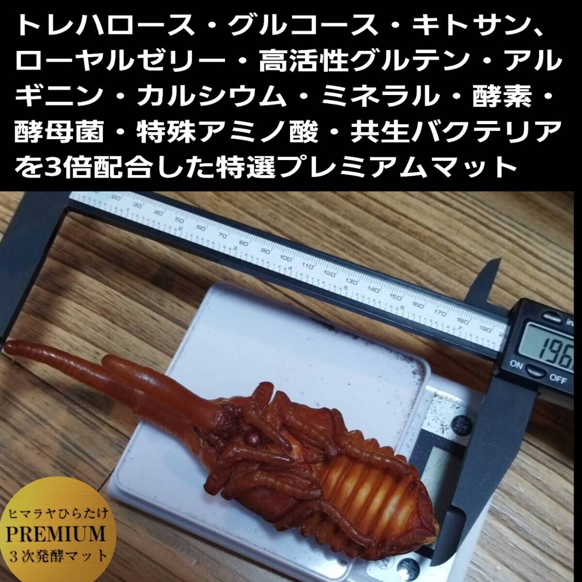 プレミアム発酵マットは外国産 のカブトムシ幼虫の餌、産卵用マットにお薦めです。 【羽化実績】 ヘラクレスヘラクレス182ミリ リッキー165ミリ ネプチューン155ミリ コーカサス127ミリ マルス131ミリ 国産カブト87ミリ ヘラクレスなどの外産はもちろん国産のカブトムシもギネスサイズがでています。 他にもヘラクレス亜種、シロカブト、ゾウカブトなどでも多数大型実績あります。 ミヤマクワガタやノコギリクワガタ、ヒラタクワガタ、オオクワガタ、ニジイロクワガタなどクワガタ全般もこのマットで大きくなったとの報告をたくさん頂いています。 クワガタでは特にミヤマクワガタではギネス級が羽化しています。 とにかく幼虫の食い付きがよくモリモリ食べます。 大型の成虫にするポイントは幼虫期間にどれだけたくさんの質の良い餌を食べさせることができるかです。 高カロリーで絶妙なバランスの栄養添加剤配合の「ヒマラヤひらたけプレミアム3次発酵マット」は幼虫の餌の中では最高峰です。 特にヘラクレスなど外産ブリーダーの方から好評でリピート注文をたくさん頂いています。 全国の昆虫ショップやカブトムシ、クワガタ専門店からも注目されお陰様で定期的に大量の注文を頂いています。