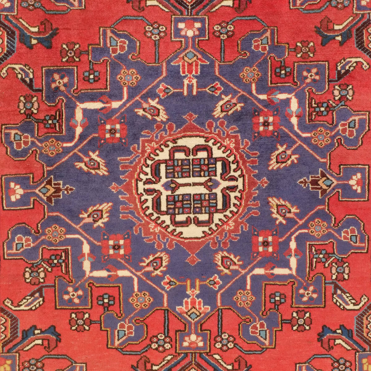 1960年代のハマダン産セミアンティーク絨毯。中央に配されたメダリオンを中心に、赤と藍による大胆な配色が印象的な一枚です。力強い構図と細部まで丁寧に織られた幾何学文様が、部族的でありながら洗練された雰囲気を醸し出しています。