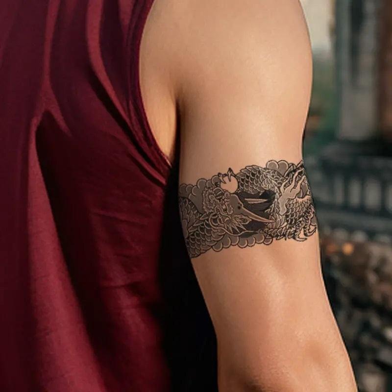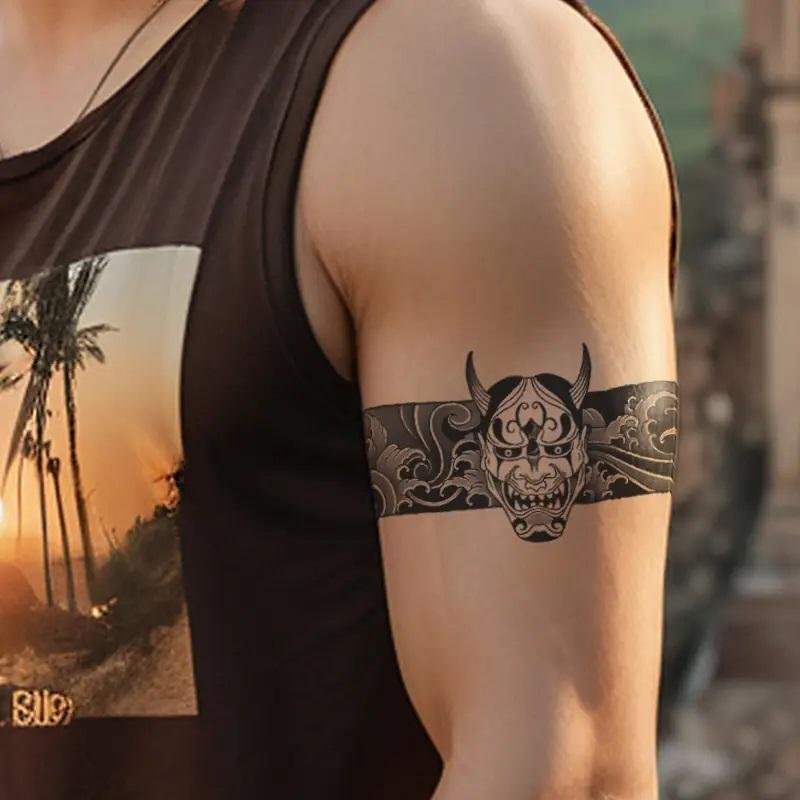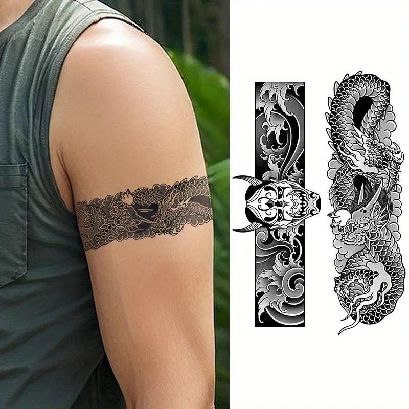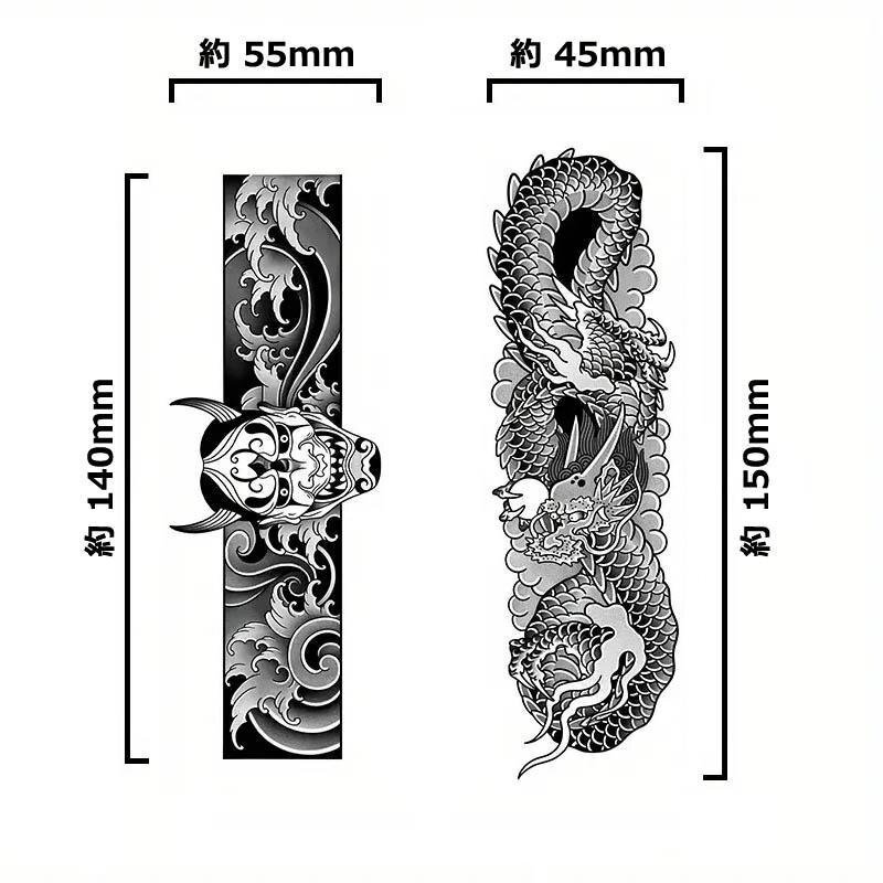 | 台紙サイズ Z 般若 約 55mm×140mm ドラゴン 約 45mm×150mm 腕や手首サイズのタトゥーシール2枚セットです。ブレスレット感覚でお手軽簡単に貼り付けできます。 ※敏感肌、目の近く、または接着剤にアレルギーがある場合は使用しないでください。 【使用方法】 ●透明フィルムを剥がし、スプレーまたは濡れタオルでステッカーをしっかりと濡らして下さい。 ●10秒間、肌に密着させ、ステッカーを剥がします。その後約2時間濡らさないで下さい。 ●約、6時間後に発色開始→約24~48時間程度で完全発色します。 ●約1~2週間持続します。 【貼る時のコツ】 シートそのままの大きさだと曲げ辛く密着しにくい為、余白部分を切ってから貼るのがコツです。 ※商品画像の色味は画面でみた場合と実際は多少の色差が生じる場合がございます。 ※海外製品のため入荷時点でしわや折れ目が付いている場合がございますが、ご使用には問題ございませんので予めご了承ください。
