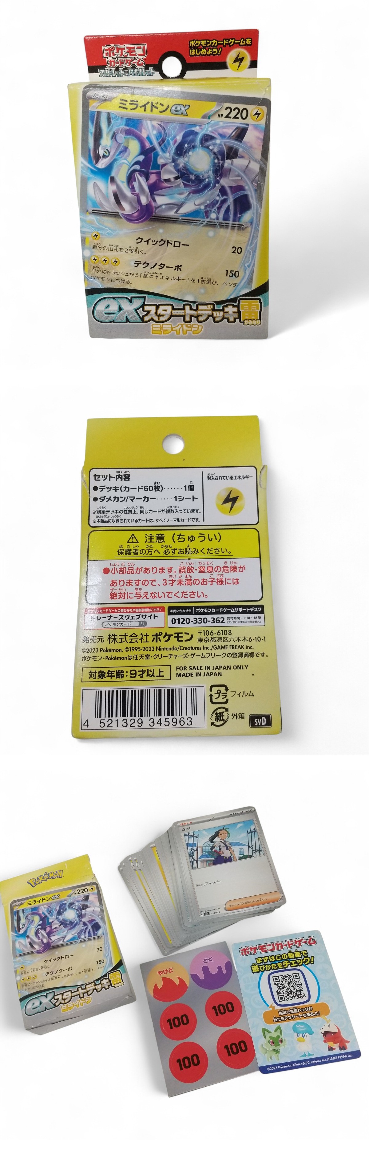 ※必ず最後までお読みください。 Please be sure to read to the end. 一定要到最后※ | 商品概要 | 数あるオークションの中からこちらの商品をご覧頂きまして誠にありがとうございます! ※商品説明と注意事項を必ず全てお読み頂いた後にご入札下さい※ 引き続き 安心できる気持ちの良いお取引を心掛けてまいりますのでどうぞ 宜しくお願い致します! 色んなジャンルの商品を多数出品しておりますので、 こちらをクリックしてご覧ください!! ◎ポケモンカードゲーム◎ポケモン Pokemon スカーレット&バイオレット exスタートデッキ 雷 ミライドン トレーディングカード 即発送 ※最下部にも写真掲載中なので必ずご覧下さい。 【商品概要】 ミライドンexのワザ「テクノターボ」とトレーナーズ「エレキジェネレーター」を活かして、相手よりもエネルギーをどんどんつけて行って展開を有利にしていきたいデッキ。 どんどんエネルギーを加速して、200ダメージを出せる「ライチュウ」や180出せる「ジバコイル」などの高火力アタッカーをどんどん育てていきたい。「ライチュウ」は200ダメージ出せますが、ワザを使うとエネルギー全トラッシュなので注意。 公式サイト⇒こちらをクリックしてご覧ください!! 【状 態】 写真をよくご確認お願い致します。外装ランク:(A) 【詳細・備考】 写真に写っているものが全てになります。 また、タイトルや本文と写真が異なる場合は写真を正とします。 保管品なので状態判断には個人差があることを予めご了承の上 写真にてご確認ご判断をお願い致します。 譲り受けたお品で当方は専門店ではないので詳細の質問にはお答えできかねます。 また簡単な検品は行っていますが、譲り受けた商品のため欠品等見落としがある場合がございますので保証等はしかねます。 ※返品不可が入札条件となります。 ※中古現状とは動作未確認のジャンク品になります。 ※通電確認とは電源に繋げてONOFFの確認のみになります。 ※バッテリーや電池は消耗品なので経年劣化がある場合もあることをご了承お願い致します。 ※保管品に関しては未使用でも新品ではございませんので、保管期間による劣化等ある場合もございますので、新品をお求めの方はご入札をお控えください。 ※ジャンク品ではなくても中古品の性質上、配送途中や到着後に万が一不備不良が起きうる場合もございますがも保証はできかねますので、返金返品不可をご了承の上ご入札お願い致します。 ※未開封品に関しては中の状態が不明な為、不具合等ございましたらメーカーとご相談お願い致します。保証対象外とさせて頂きますのでこちらでは対応いたしません。 尚、実際の色とパソコンや携帯の画面を通じた色彩は異なる場合もございますのでお気をつけ下さい。 =外観ランク表記= (N)長期保管/未使用品(新品ではございません) (S)数回程度使用の美品 (A)多少の傷、若干の使用感がありますが程度良好の美品 (B)一般的な使用感あります。 (C)汚れ、使用感を感じるがまだまだ使える品物 (D)汚れ、使用感等が見受けられる難有品 (E)ジャンク品 ※大体の目安としてお考え下さい。 新品に近いものをご希望の方や神経質な方のご入札はご遠慮下さい。 ご入札頂いた時点で本文説明文に了承を頂き、商品にご納得して頂いたと当方で判断させて頂きますので 【ノークレーム・ノーリターンがご入札の条件となります】 また、弊社のオークションでは いろんなジャンルで多数出品しておりますので是非ご覧ください(^_-)-〇 ![]() ▶入札の取り消しは受け付けておりません。 落札後の質問やキャンセルも受け付けておりません。 尚、営業時間が9-18時となっておりますのでオークション終了間際や質問内容によっては返答できない場合がございます。 ジャンク商品に関してはいかなる場合も返品返金の対応はできかねます。 落札後のサイズ違いやイメージ違い等のキャンセル、クレーム、返品等はお受けできませんので予めご了承ください。 ご入札の方につきまして、当方にて評価が著しく悪いと判断した場合は、トラブル防止の観点からご入札を取り消させていただく場合がございますので予めご了承ください。 新規IDの方や、いたずら入札と判断した場合、入札削除させていただく場合がございますので、新規の方は質問欄にて購入意思を示してからのご入札をお願い致します。 ※の障害等で入札が不適切に成立した場合は落札された場合でも削除対象になりますことを予めご了承お願い致します。 取り置きは可能ですが物や金額によってはすぐに決済をお願いする場合がございます。 当方大量の商品を管理している為、複数落札の同梱ご希望の方は、「まとめて取引」の依頼を必ず行ってください。 ◆連絡方法◆ ▶当方連絡事項は全て取引ナビを使用しております。 ご連絡先、ご要望等は必ず「取引ナビ」にご入力お願い致します。※ご入札前の場合はdiamonds100ct@yahoo.co.jpまでお願い致します。 ⇩⇩下記の注意事項を必ずお読み下さい。⇩⇩ 