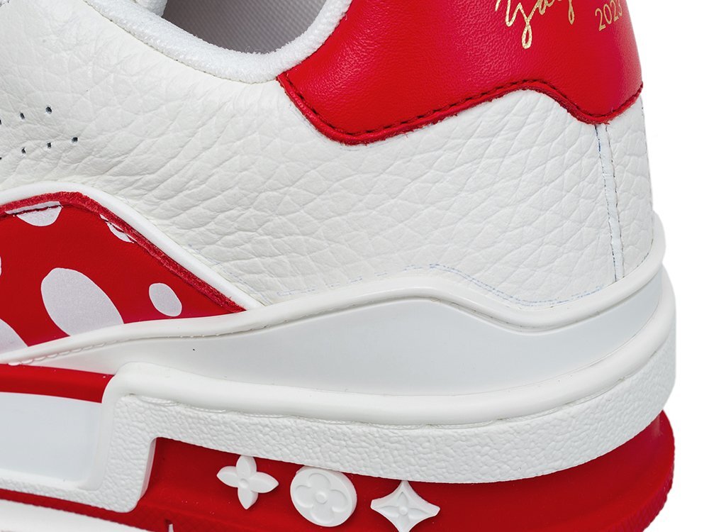 | 2012年の初コラボレーションから10年を経て、日本を代表する世界的アーティスト草間彌生とルイ・ヴィトンによるグローバルなコラボレーションが2022年に再び発表され、2023年1月から発表された LV × YKシリーズより、トレイナーライン スニーカー「1AB991」レッド・ホワイトの2トーンカラーモデル、レディースサイズです。2021年に早逝したヴァージル・アブローのデザインによる定番モデルのスニーカーに、草間彌生を一躍有名にしたインフィニティ・ドット・モチーフがあしらわれ、背面にはコラボレーション・シグネチャーが添えられています。