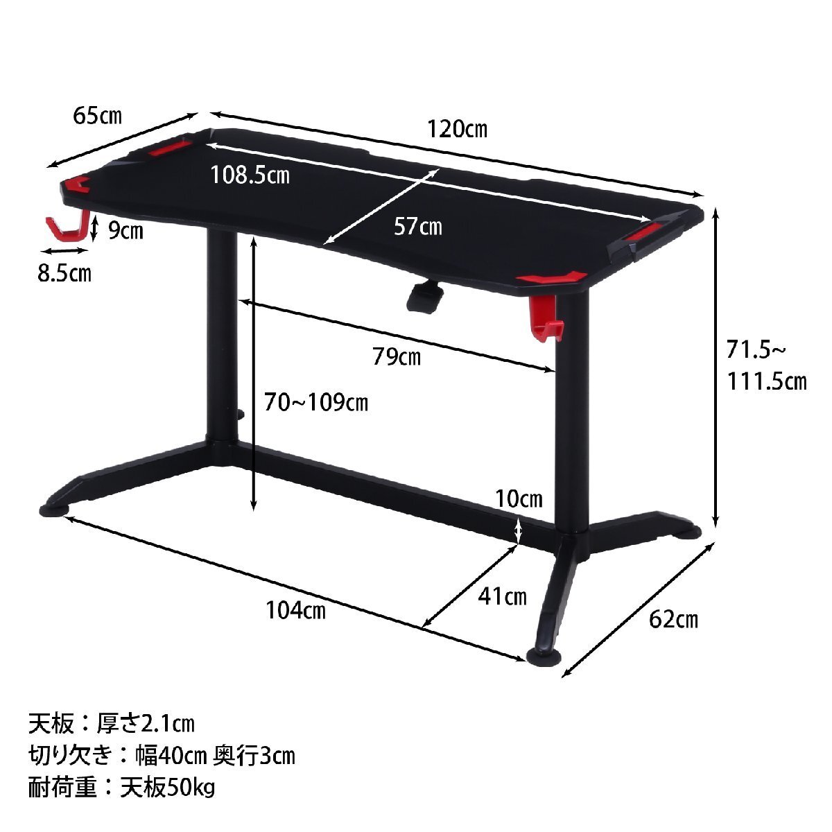 | 備 考 | ■広々120cmの何でも使えるデスクです。 ■作業台やパソコンテーブルとしても使えます。 ■ゲーム用デスクとしても通常デスクワークも可能なシンプルデザイン。 ■天板ガス圧昇降機能付き(715-1115mmと400mm可動域あり)です。 ■好みの高さに合わせて使用できるプロ仕様です。 |