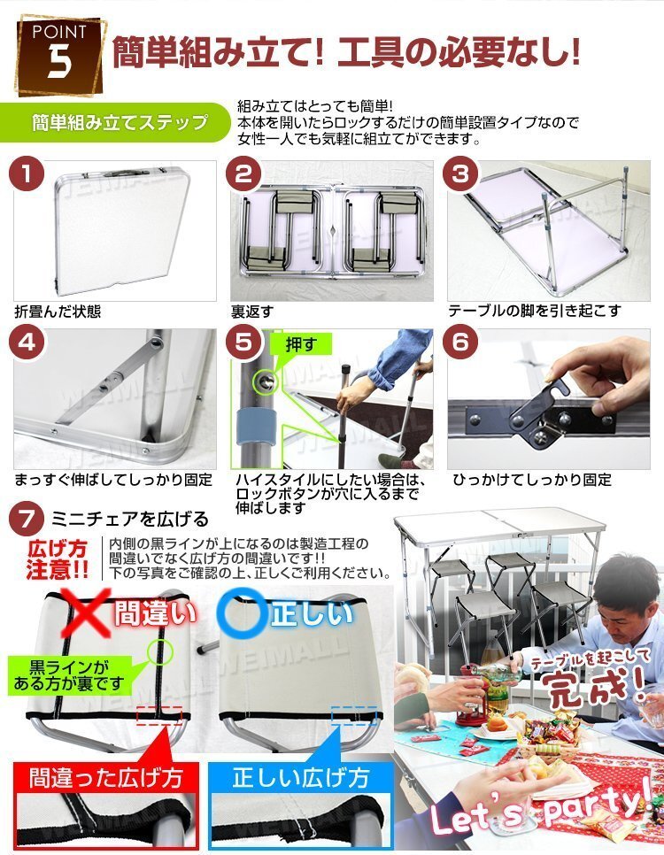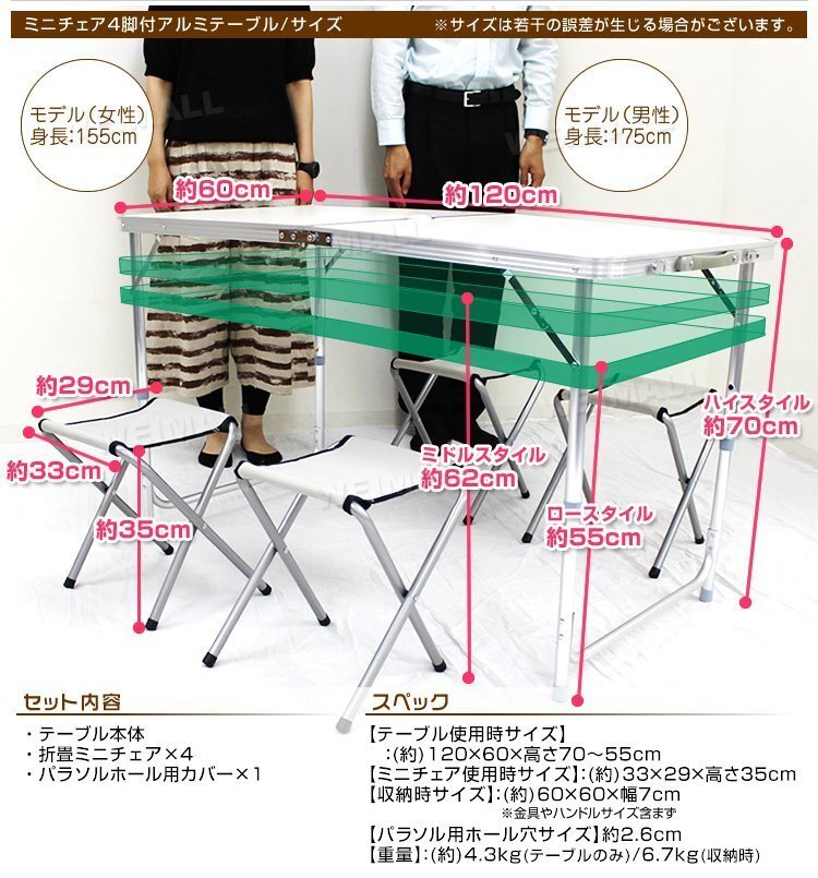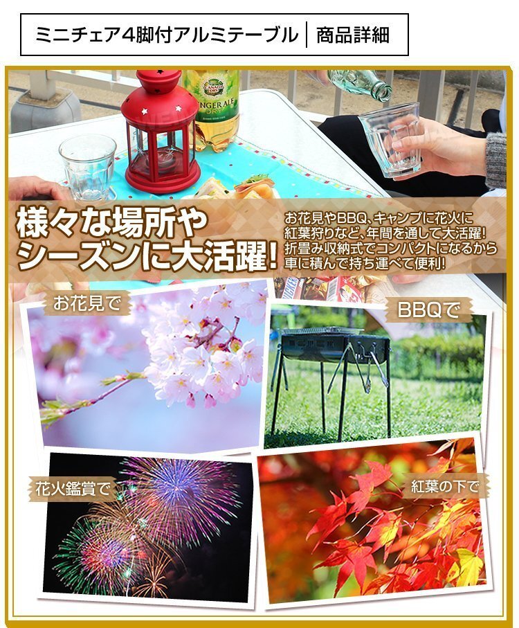 | 軽量アルミ製+取っ手付きで持ち運びしやすい! 椅子はテーブルの中に収納し折りたためるので、車のトランクに積んで移動もラクラクです。 開いてロックするだけの簡単設置タイプなので、女性でも1人で組立カンタン! テーブルは3段階の高さ調節ができ、ローテーブルとしても使えます。 天板中心部にはパラソル用ホールがあるので、ベランダやテラスでの使用にもおススメです♪ 【商品詳細】 サイズ(約) テーブルサイズ:幅120×奥行60×高さ56/70cm 収納サイズ:幅60×奥行7×高さ60cm チェアサイズ:幅34×奥行28×高さ37cm パラソル用ホール直径サイズ:26mm 重量:(約)4.3kg ※テーブルのみ 耐荷重:(約)テーブル25kg / イス70kg 材質:(天板)MDFボート(耐熱・防水加工) (外枠)アルミニウム、スチール、ポリプロピレン 他 カラー:ブラウン 【注意事項】 ・海外製品で簡易梱包での輸入の為風防に擦れや多少の小キズなどがある場合がございますが 商品自体には問題ありませんのでご了承下さい。 (アルミレジャーテーブル 折りたたみ テーブル アウトドア ピクニックテーブル 折りたたみテーブル) |