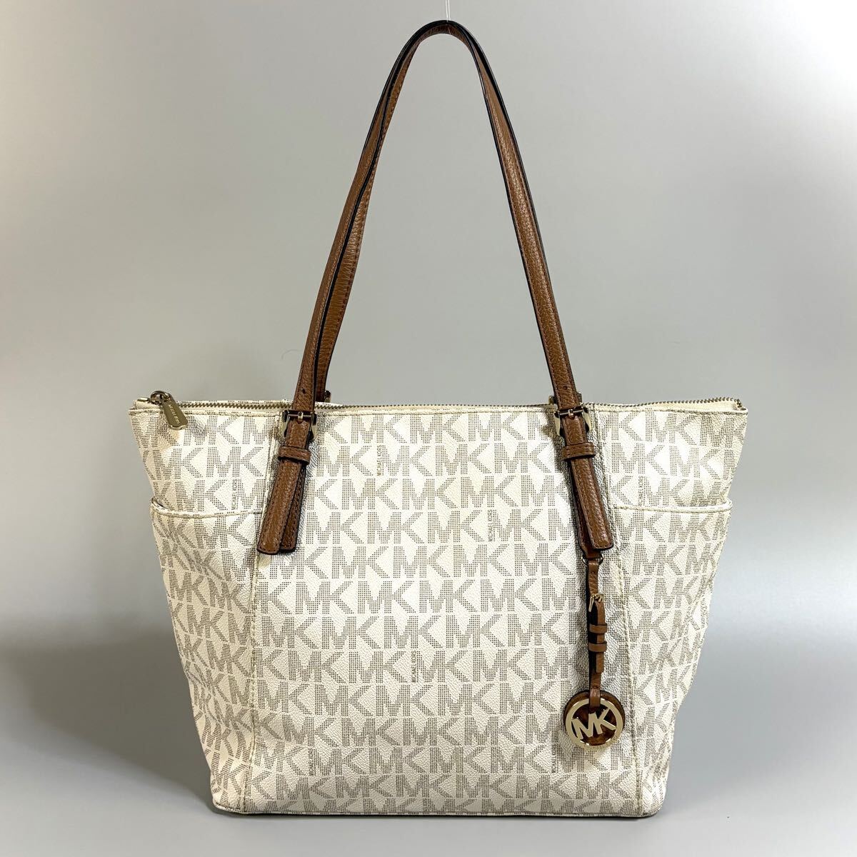 | 【美品】MICHAEL KORS マイケルコース PVC レザー 総柄 大容量 トートバッグ ハンドバッグ シグネチャー ホワイト ブラウン チャーム付き |