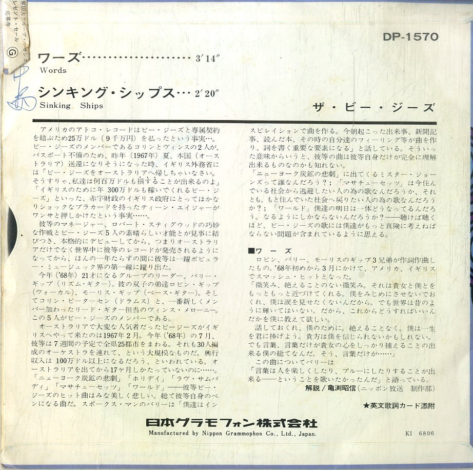 C00178473/EP/ビー・ジーズ(BEE GEES)「Words / Sinking Ships (1968年・DP-1570)」 [浏览原始页面]