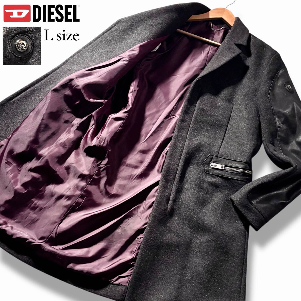 極美品/Lサイズ●DIESEL ディーゼル 山羊革切替 ゴートレザー袖 ウール系 ジップ チェスターコート ロング丈 裏地紫 パープル 肩ロゴ金具
