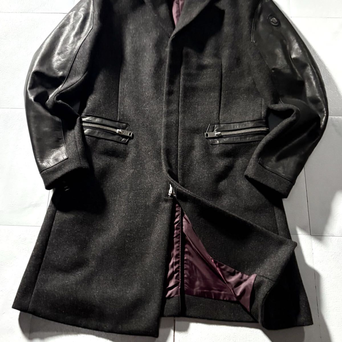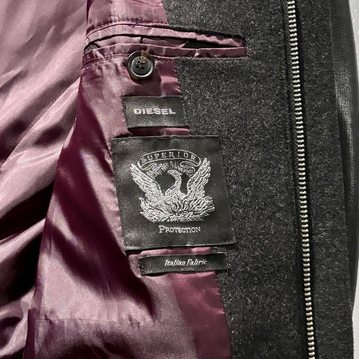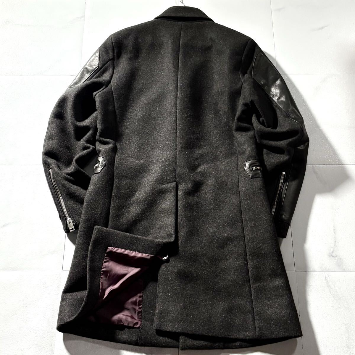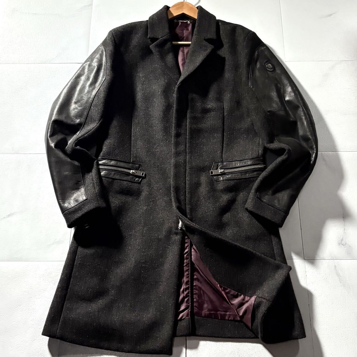極美品/Lサイズ●DIESEL ディーゼル 山羊革切替 ゴートレザー袖 ウール系 ジップ チェスターコート ロング丈 裏地紫 パープル 肩ロゴ金具 [浏览原始页面]
