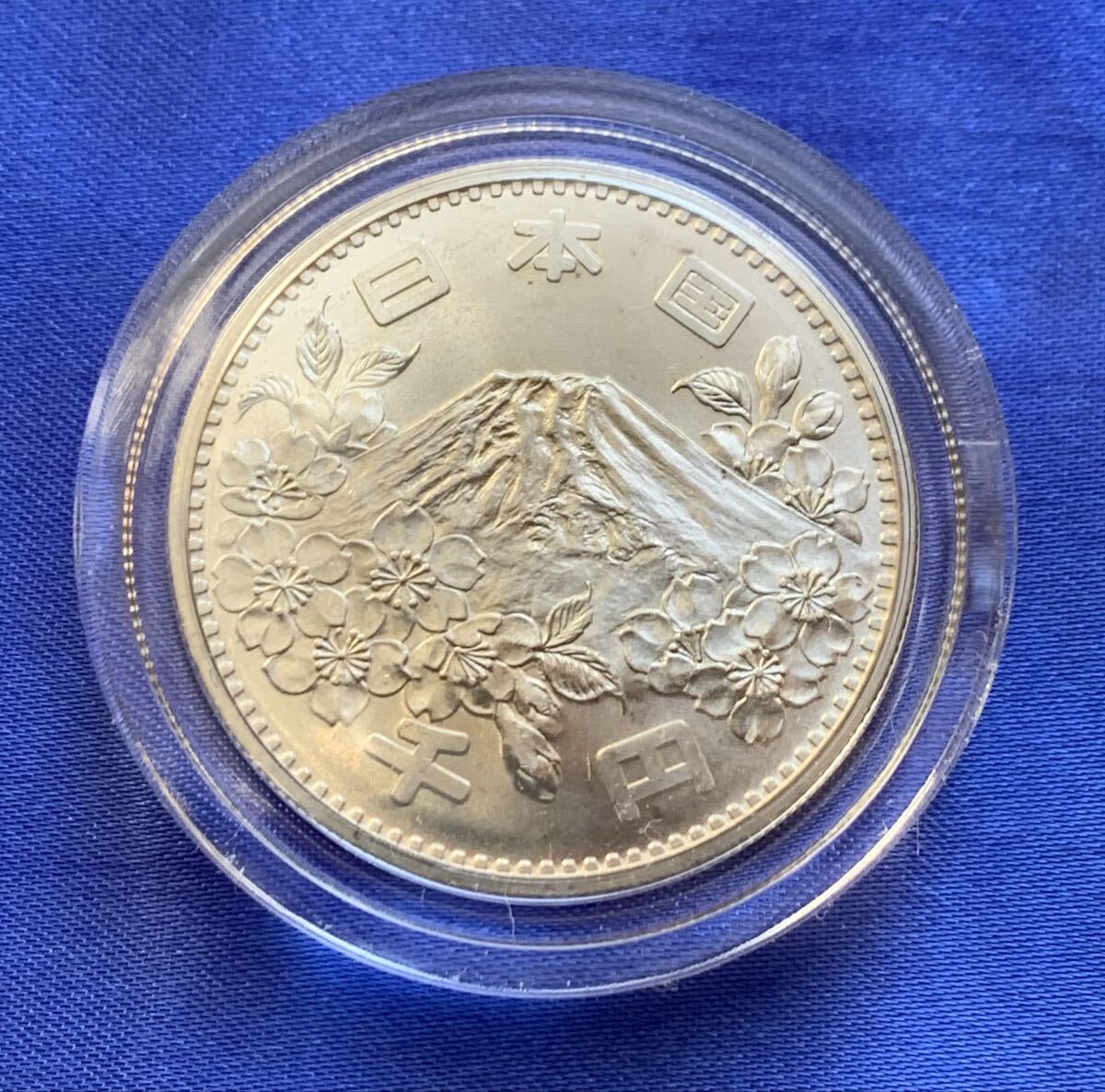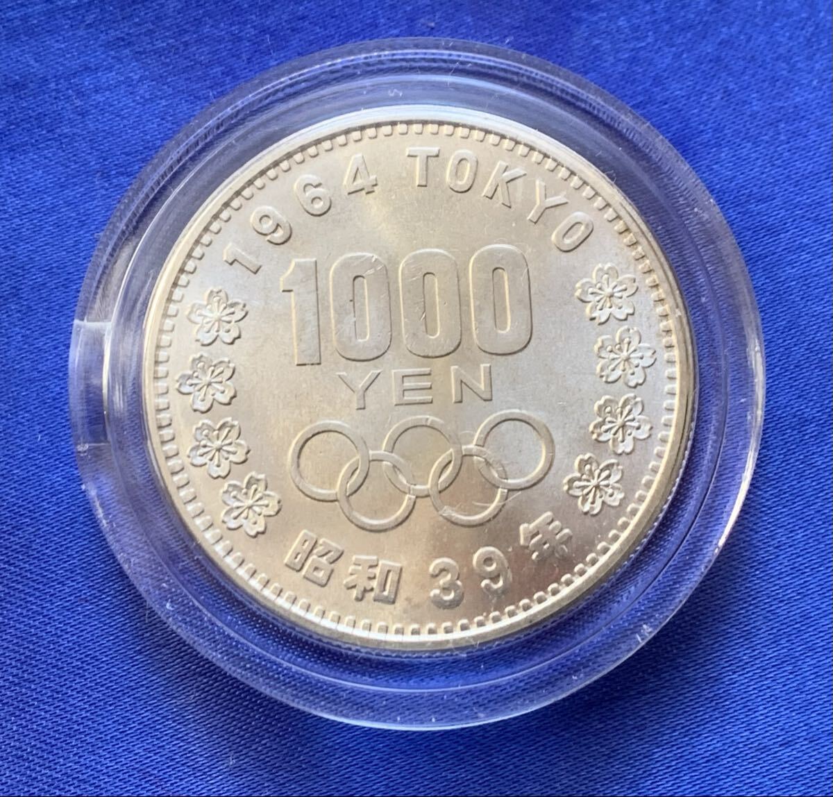 ◆東京オリンピック記念1000円銀貨 昭和39年 図 案:富士と桜 発行日:昭和39年10月(1964年) 直 径:35mm 品 位:銀925/銅75 量 目:20g |