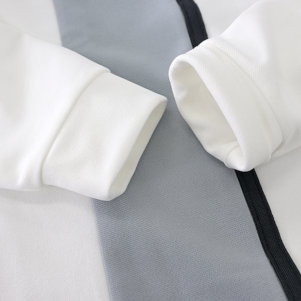 | 新品 未使用 紙タグあり Lサイズ(画像は別サイズで撮影) チェスト96~104 ※商品に記載されたサイズ・寸法です※ 肩幅44cm 身幅53cm 袖丈58cm 着丈68cm ※伸縮性がある素材のため多少誤差が生じることがあります※ ポリエステル95% ポリウレタン5% ホワイト×グレー×ブラック |