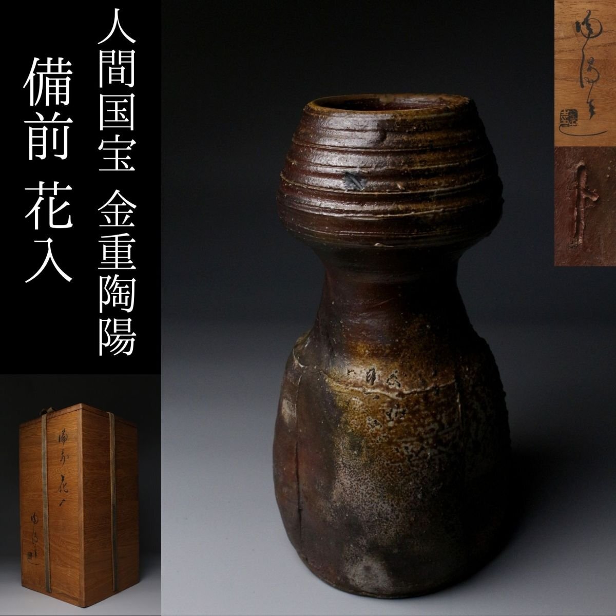 [.QU]25.11 25110906A* * * 商品詳細 * * * ここでしか出逢うことのできない唯一の美をご紹介させて頂きます。 作家略歴 1896年 岡山県備前に生まれる。金重家は備前六姓のひとつ 1910年 父について作陶をはじめる 1918年 彩色備前を作り始める。「陶陽」の号を用いる 1956年 備前焼の重要無形文化財保持者に認定 1966年 紫綬褒章受章 1967年 天皇皇后両陛下備前ご来訪の際、御前制作 11月6日歿。享年71。勲四等旭日小綬章受章 ■商品内容/ 花瓶、共布、共箱 ■サイズ/横12㎝×高20.5㎝ 箱:四方15.5㎝×高29.5㎝ ■状態/ 僅かなスレ、小傷、汚れ 箱にスレ、小傷、汚れがございます。 ※写真にてご確認、ご了承の上ご入札下さい。
