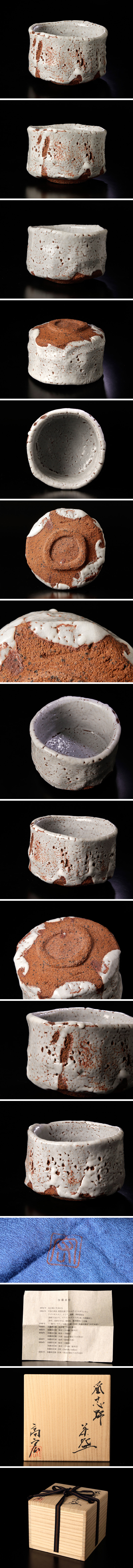 父親は加藤重高、祖父は陶磁史研究家、陶芸家の加藤唐九郎。 有名な陶工の家系に生まれ、その伝統を守りつづけている加藤高宏。 淡く鼠色を帯びた柔らかな釉の下から荒々しい土肌が趣深くあらわれ、手に馴染む自然な歪みと景色の対比が一碗に独特の温もりと力強さを宿す、茶席を豊かに彩る存在感ある逸品です。 ★商品は加藤高宏の作品である事を保証致します。 |