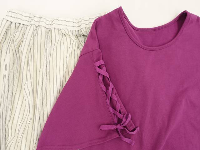 洗える5分袖カットソー+長袖ニットカットソー+ひざ丈レースギャザースカート コーディネート上下3点セット M相当 パープル/ブルー系/アイボリー×ブラック ストライプ柄 フェミニン系 20代~