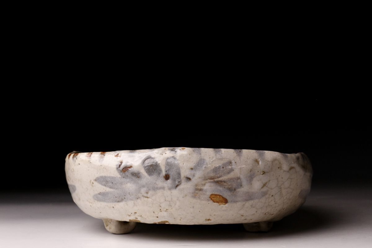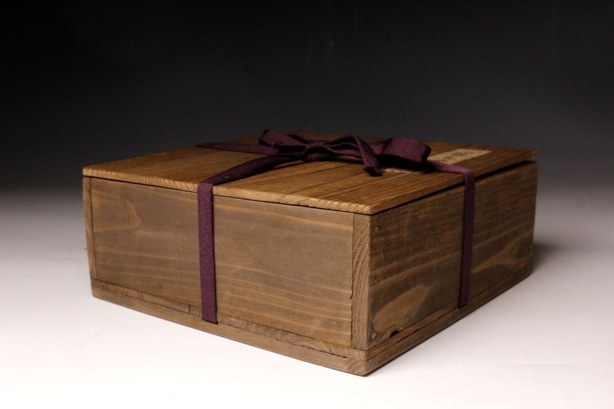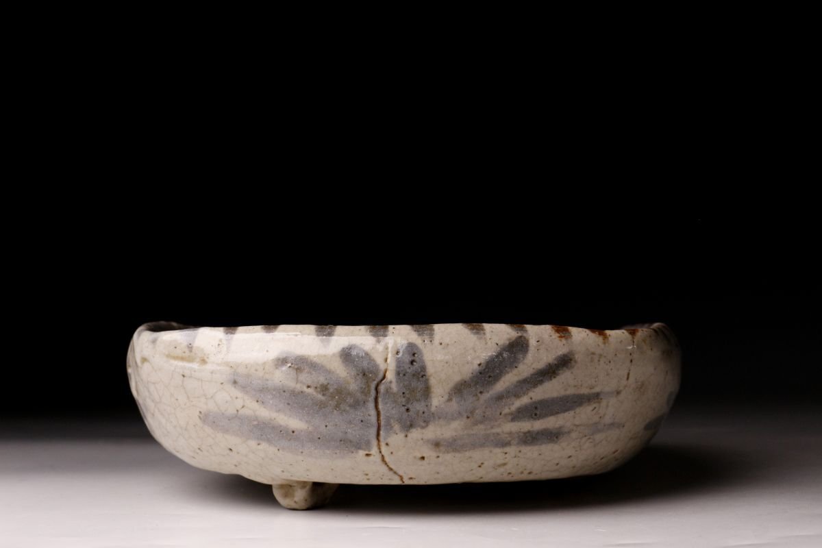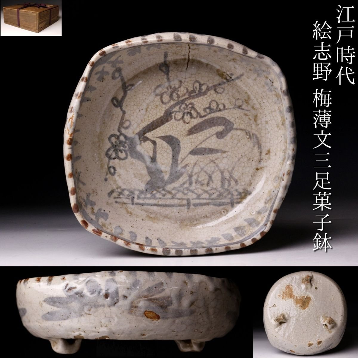 [.QU]25.06 25062317 T* * * 商品詳細 * * * ここでしか出逢うことのできない唯一の美をご紹介させて頂きます。 古志野 絵志野 梅薄文三足菓子鉢をご紹介。 時代を超えてなお、凛とした存在感を放つ一鉢。 桃山から江戸初期にかけて焼成された、古志野の三足菓子鉢。力強く厚く掛けられた釉薬は、焼成の妙による深い表情を湛え、まさに用と美の調和を体現しています。 絵付けには梅と薄が鉄絵で伸びやかに描かれ、素朴ながらも洒脱な趣が感じられます。長い年月の中で酸化し、独特の志野錆をまとったその顔料は、まさに古志野の真骨頂。 三足の造形は、ただの器を超えた“造形美”を生み出し、静と動が融合する独特の佇まいとなっております。 肌地には経年による貫入や窯変が見られ、触れるごとに骨董ならではの風格が伝わってくる名品です。 そのひとつひとつの表情に、茶の湯の美意識と、桃山陶の自由な気風が息づいています。 一期一会のご縁として、ぜひお手元にお迎えください。 ■商品内容/ 鉢、箱 ■サイズ/横21㎝×高20.5㎝×奥行6㎝ 箱:横24㎝×高10㎝×奥行24㎝ ■状態/ スレ、傷、汚れ、ヒビ、ニュウ、直し、欠け、箱にスレ、傷、汚れ、蓋に浮きがございます。 ※写真にてご確認、ご了承の上ご入札下さい。