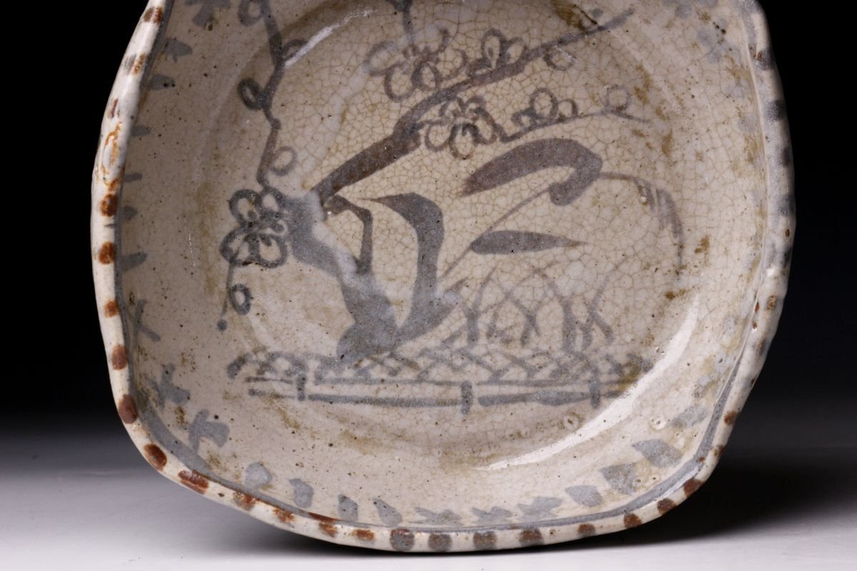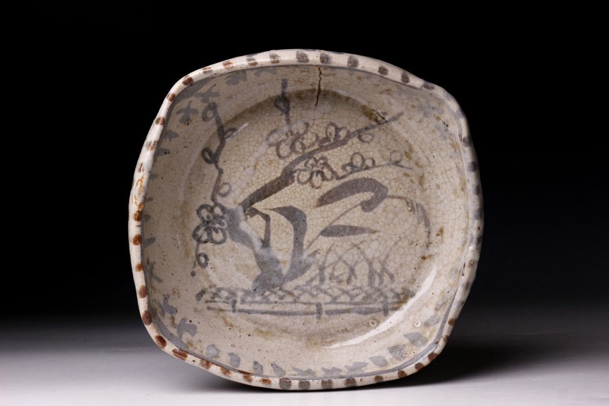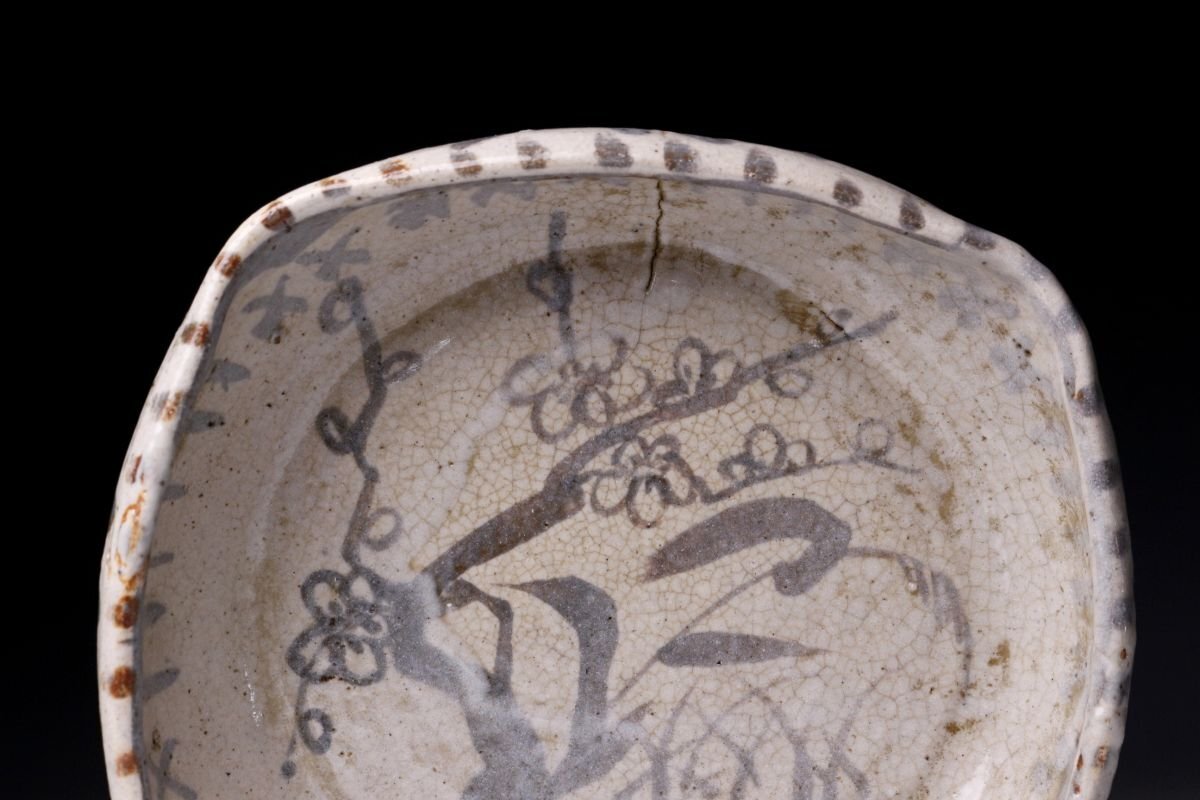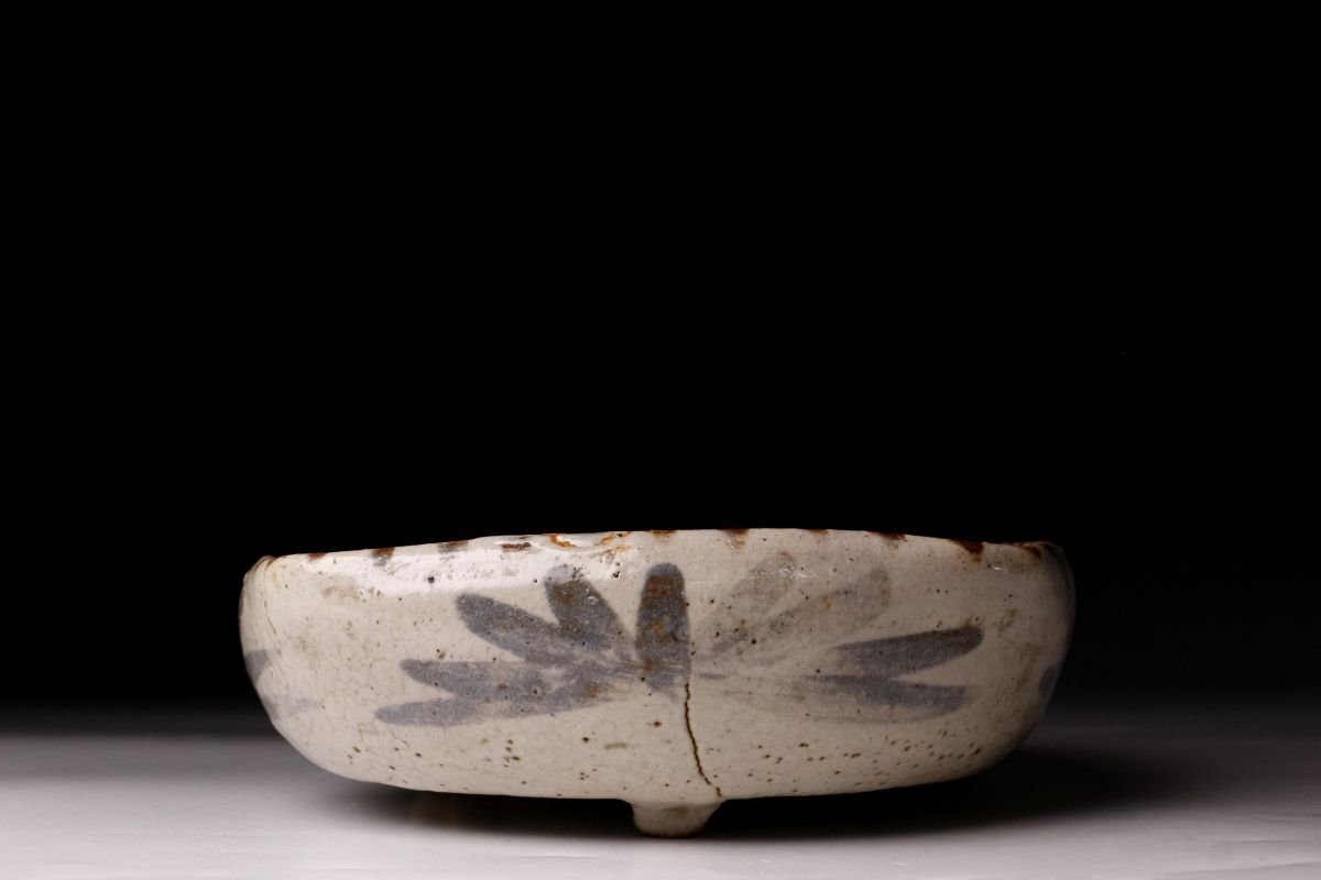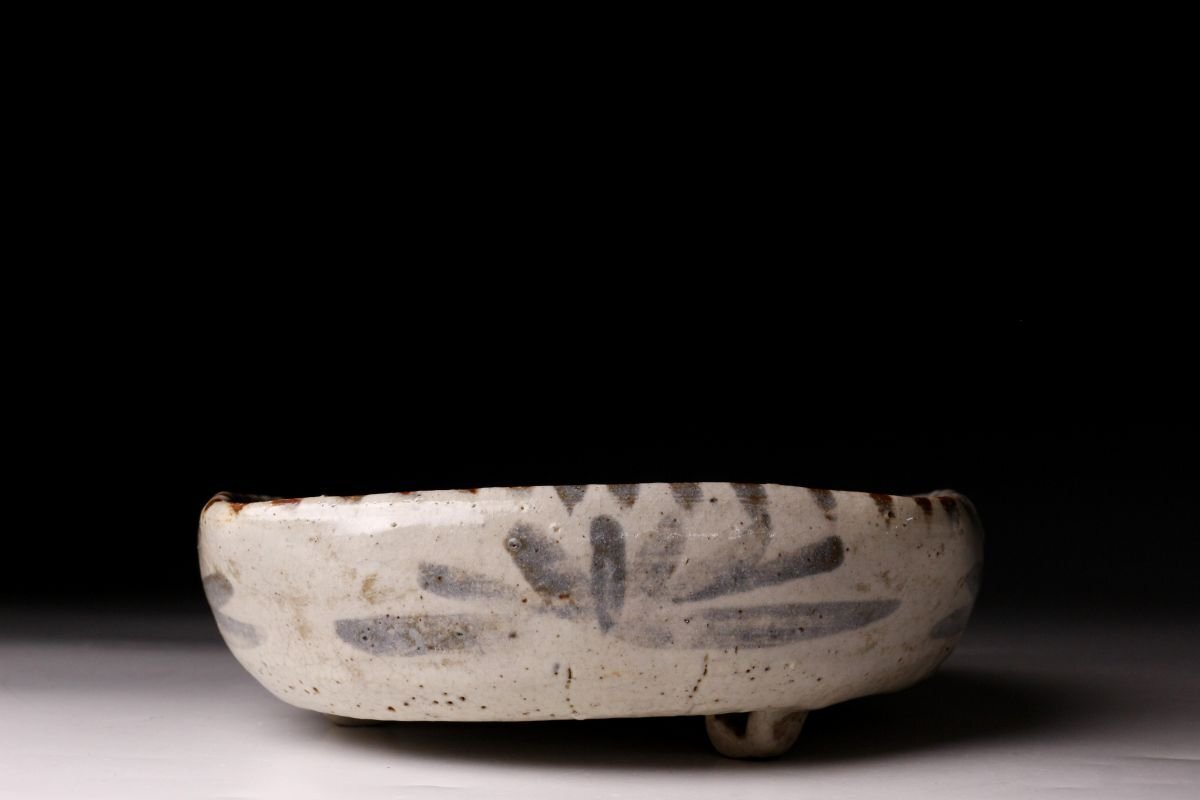 [.QU]25.06 25062317 T* * * 商品詳細 * * * ここでしか出逢うことのできない唯一の美をご紹介させて頂きます。 古志野 絵志野 梅薄文三足菓子鉢をご紹介。 時代を超えてなお、凛とした存在感を放つ一鉢。 桃山から江戸初期にかけて焼成された、古志野の三足菓子鉢。力強く厚く掛けられた釉薬は、焼成の妙による深い表情を湛え、まさに用と美の調和を体現しています。 絵付けには梅と薄が鉄絵で伸びやかに描かれ、素朴ながらも洒脱な趣が感じられます。長い年月の中で酸化し、独特の志野錆をまとったその顔料は、まさに古志野の真骨頂。 三足の造形は、ただの器を超えた“造形美”を生み出し、静と動が融合する独特の佇まいとなっております。 肌地には経年による貫入や窯変が見られ、触れるごとに骨董ならではの風格が伝わってくる名品です。 そのひとつひとつの表情に、茶の湯の美意識と、桃山陶の自由な気風が息づいています。 一期一会のご縁として、ぜひお手元にお迎えください。 ■商品内容/ 鉢、箱 ■サイズ/横21㎝×高20.5㎝×奥行6㎝ 箱:横24㎝×高10㎝×奥行24㎝ ■状態/ スレ、傷、汚れ、ヒビ、ニュウ、直し、欠け、箱にスレ、傷、汚れ、蓋に浮きがございます。 ※写真にてご確認、ご了承の上ご入札下さい。