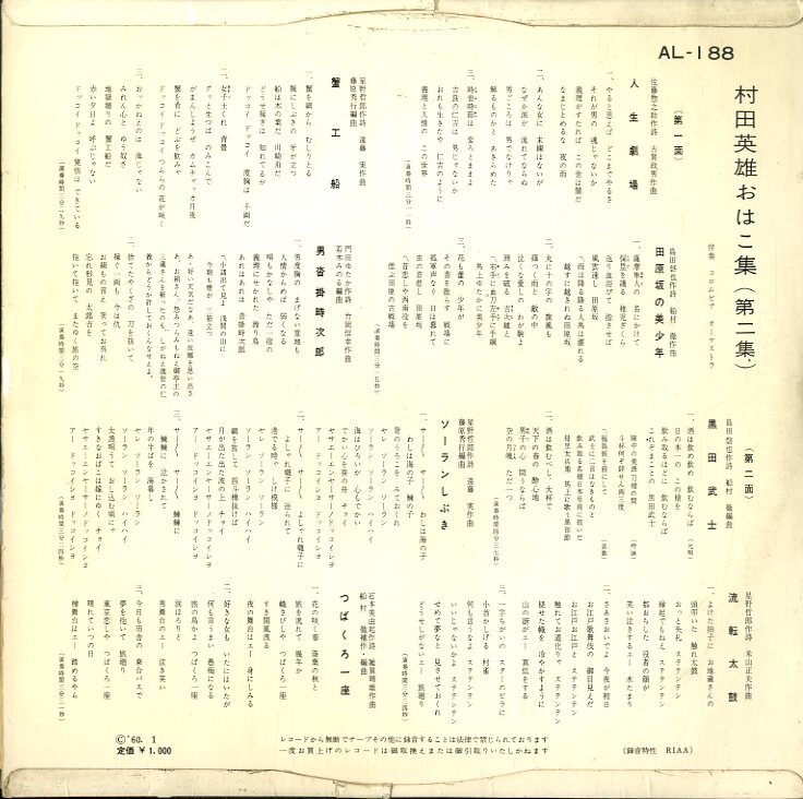 A00457094/10インチ/村田英雄「おはこ集(第二集)(1960年・AL-188)」 [浏览原始页面]