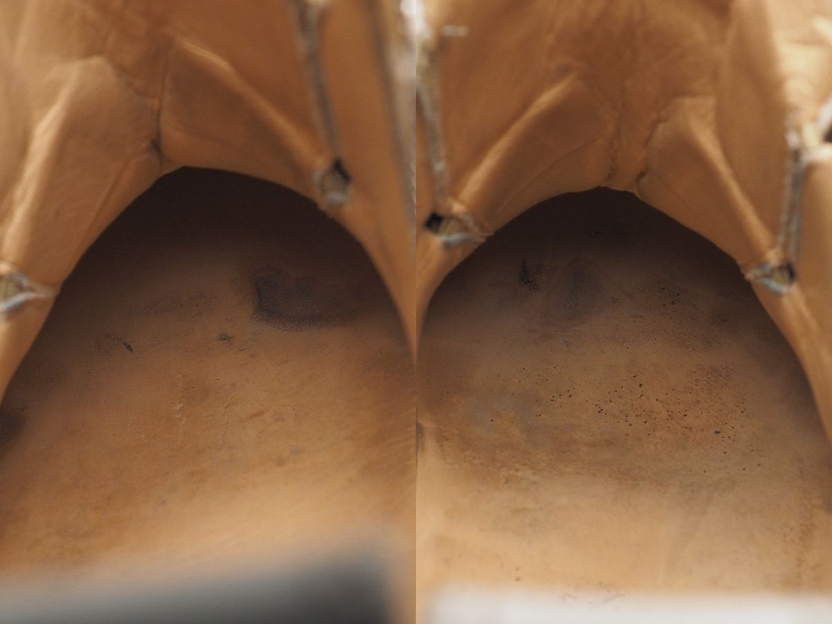 【コンディション詳細】 アッパーのシワ、ストラップの汚れ、またレザー面の小汚れ、インソールやライニングの汚れ、シミ、またインソールのかかと部分に凹みが見られますが、その他支障になるようなダメージ等はなくこれからも十分にご愛用いただけるコンディションです。 アウトソールの減りはトゥ・ヒール共に1mm程度です。 |
