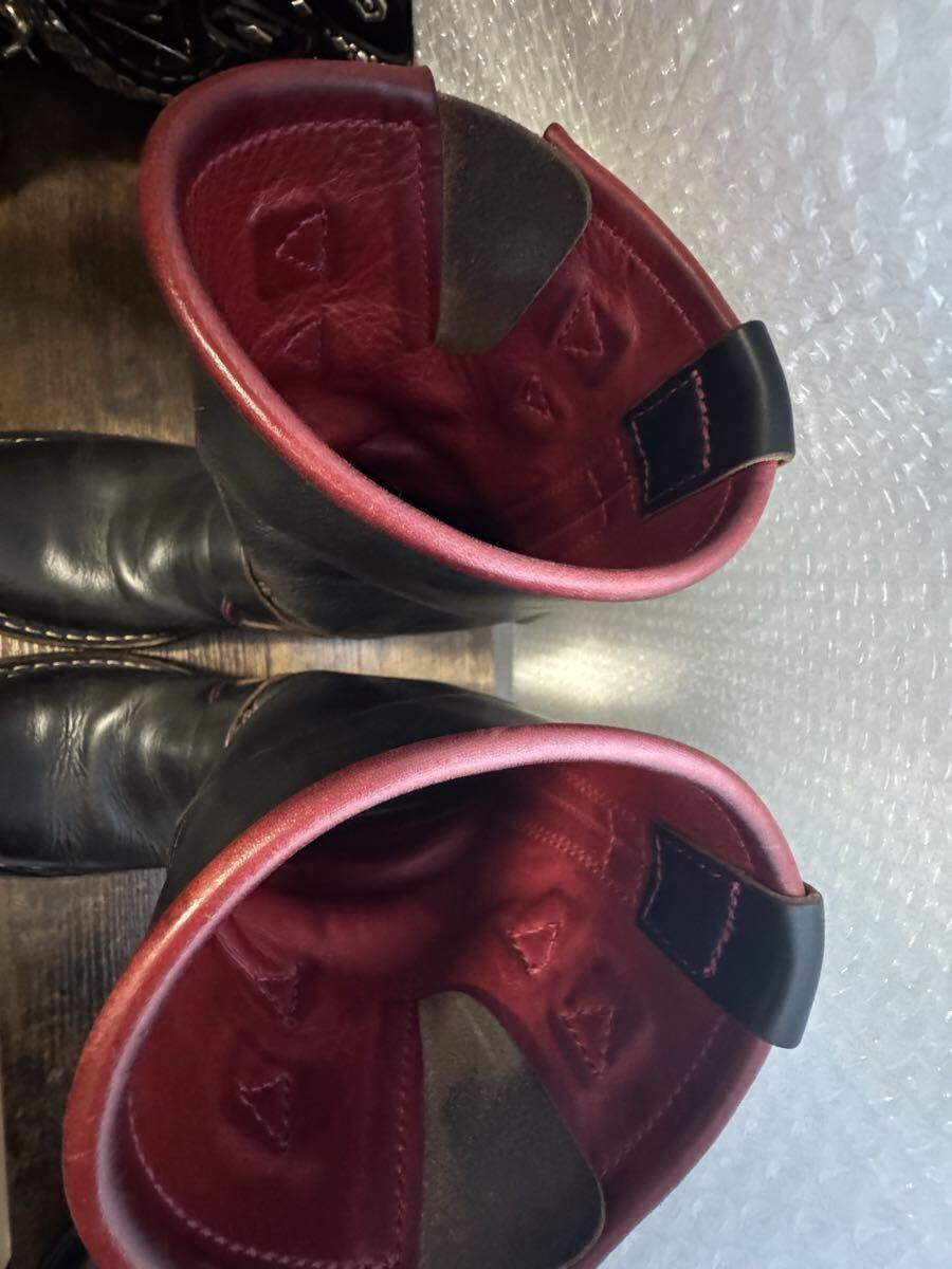 こちらの商品はリブロスファクトリーのエンジニアブーツになります。クロムエクセルレザーの茶芯ブラックでライニングはレッドのレザーライニング、ステッチもレッドでダブルバックルで非常にカッコイイです。サイズ表記が無く、当普段ブーツは9Eか9.5Eなんですがインソールを入れないと少し大きめな感じで現在インソールを入れて当方のサイズ27.5センチで良い感じです。インソール入れて発送致します。確かもう作られていないはずです探されていた方是非宜しくお願い致します。| 出价者 | 信用 | 价格 | 时间 |