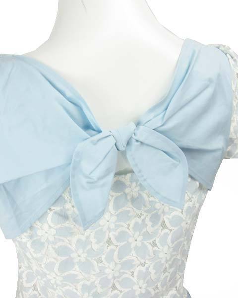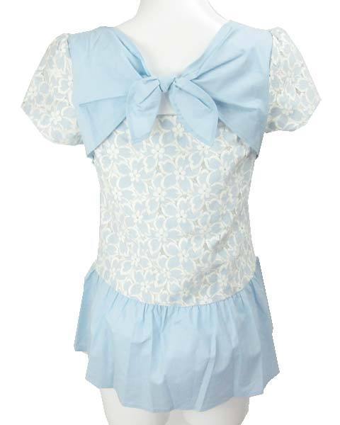 | バックスタイルも可愛い♪フェミニンデザイントップス☆お花レースと布帛の切り替えデザインがお洒落なデザイン。レースの身頃部分には裏地が付いていますので、安心です。肩のレースとバックのリボンの下からのぞく肌がアクセント♪夏のお出かけスタイルにピッタリなアイテムです。 |