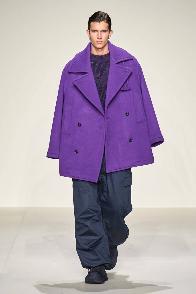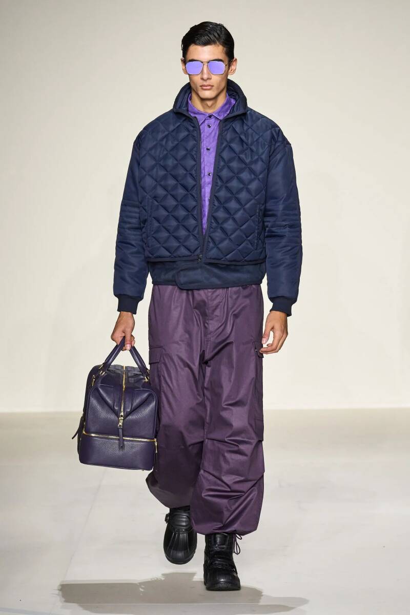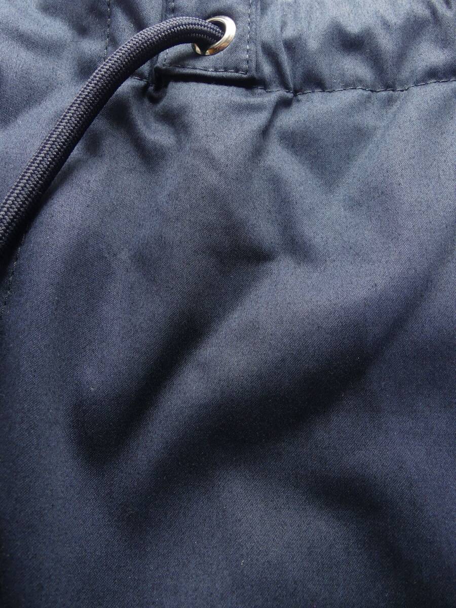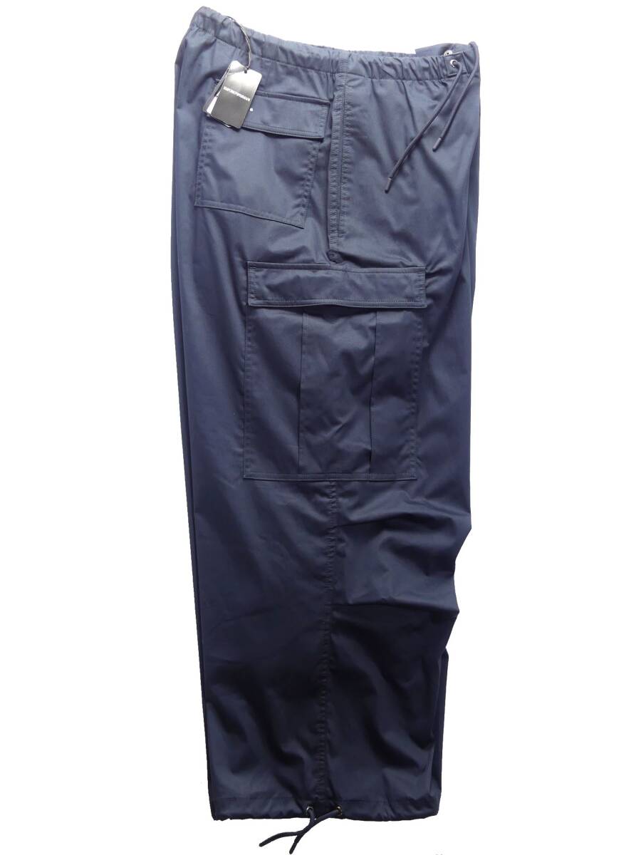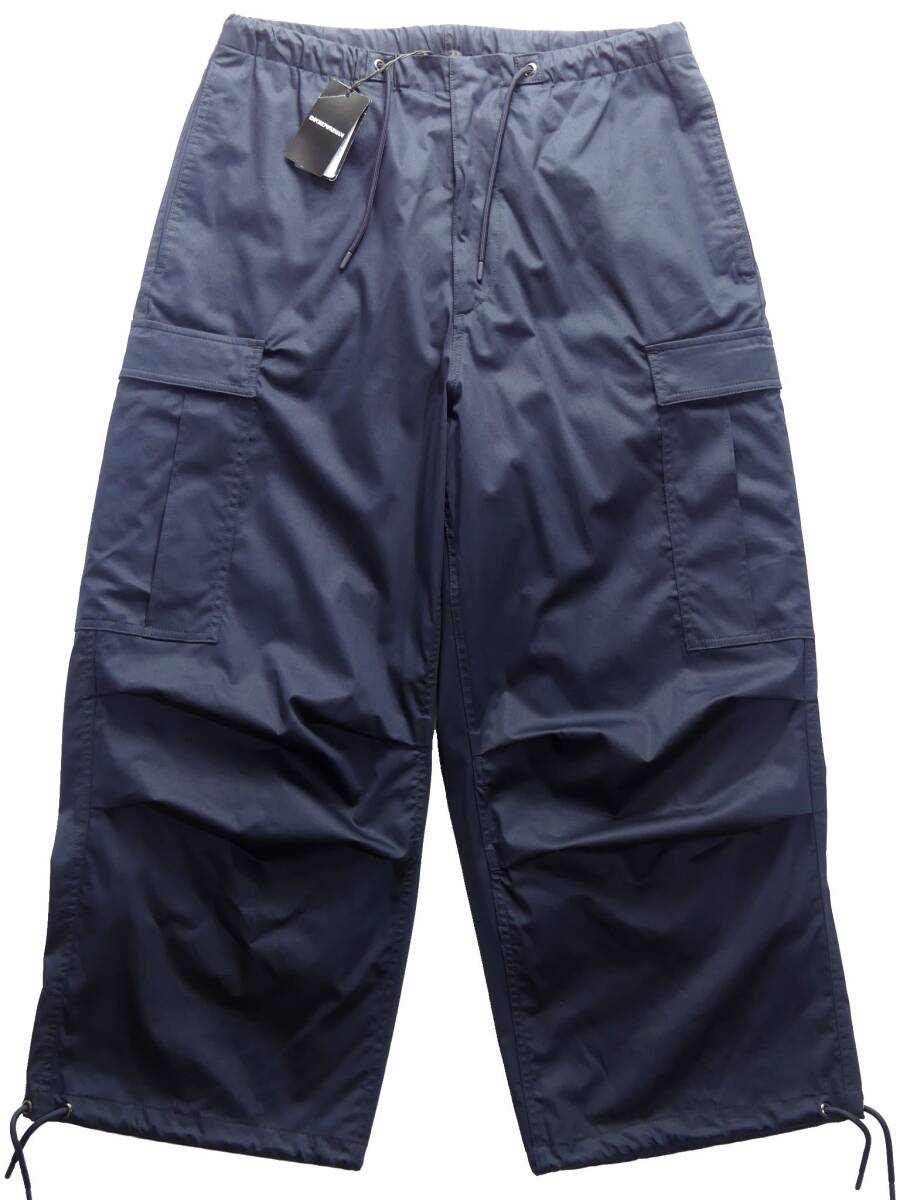 コレクションランウェイに登場した6ポケット濃紺カーゴパンツ。ご覧のとおり無骨感満点のミリタリーライクなデザインで、ボリュームのあるトップスにも負けない、思いっきり太いシルエットが特徴です。このパンツはキルティングインナーが着脱できる2重構造になっていて、表地はサラッとした目の細かいコットン生地。インナーはキルティングパディングの「ももひき」みたいなライニング。着脱ができますので春夏はももひき無しで着用できて、秋冬は2重にして防寒パンツとして使えるオールシーズン物になります。掲載しましたランウェイルックはコートを着ている関係でパンツが見えにくいため、お色違い紫モデルのルックも掲載しました。ミリタリー実物の6ポケットカーゴよりも太いデザインで、キルティングインナーを付けているためシルエットがしっかり出てボリューム満点です。表地コットン生地は艶がありますので上質なトップスとも馴染みが良く、ここは実物ミリタリー物とは大きく違うポイントです。気になるサイズ、フィッティングに関しましてはドローコードで腰にアジャストさせるイージーパンツの作りでゴム伸縮しますので、サイズが合わないという心配はありません。出品のイタリアサイズ48は日本サイズM相当を想定したサイズです。そもそもウエストが大きめの作りで伸縮させないで日本サイズLの実寸です。さらに伸縮しますので適正サイズは日本サイズMからXLまで、イタリアサイズなら48から52まで、インチ表記なら32から36インチまでのお客様向けサイズになります。実際のところもっと伸びるのでさらに上サイズまで対応しますが、キルティングインナーがウエスト値93㎝で伸縮しませんので、日本サイズXXLのお客様には少し小さい可能性があります。