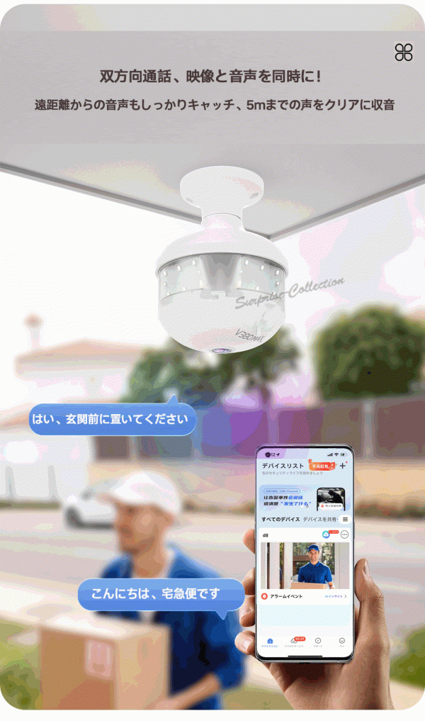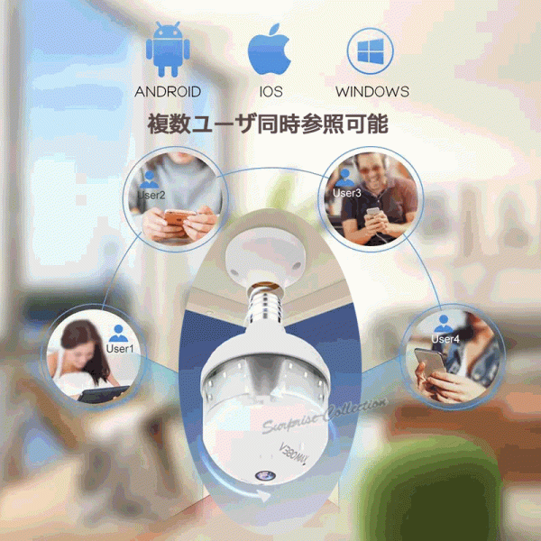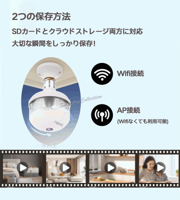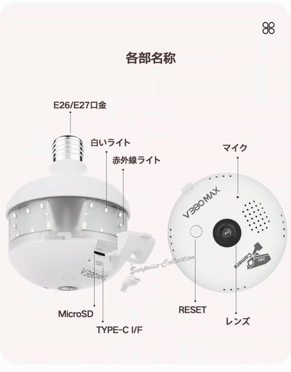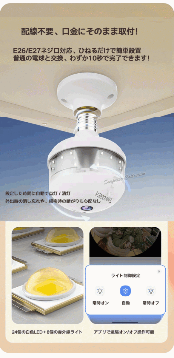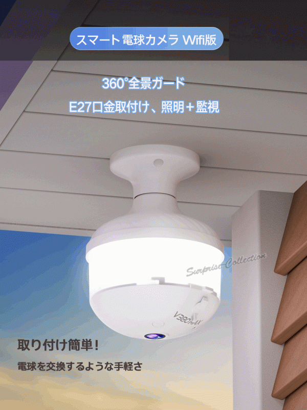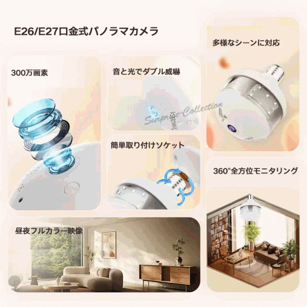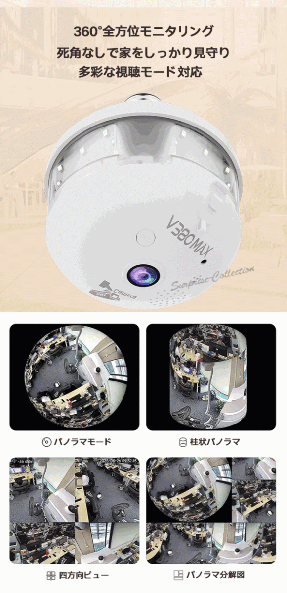 機能:口金式パノラマカメラ 360°全景ビュー 300万画素 双方向音声 128GB対応 人体検知 アラーム通知 赤外線 照明 監視