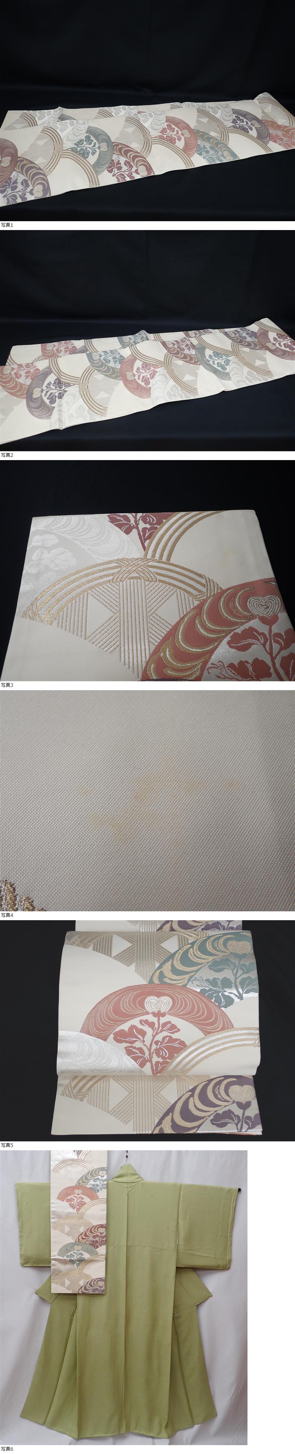 秀品 やまと謹製 正絹 色無地 一つ紋 金糸 身丈147.5cm(+15cm) 裄丈61.5cm 袋帯 正絹 扇紋 金糸 銀糸 2点セット | ||||