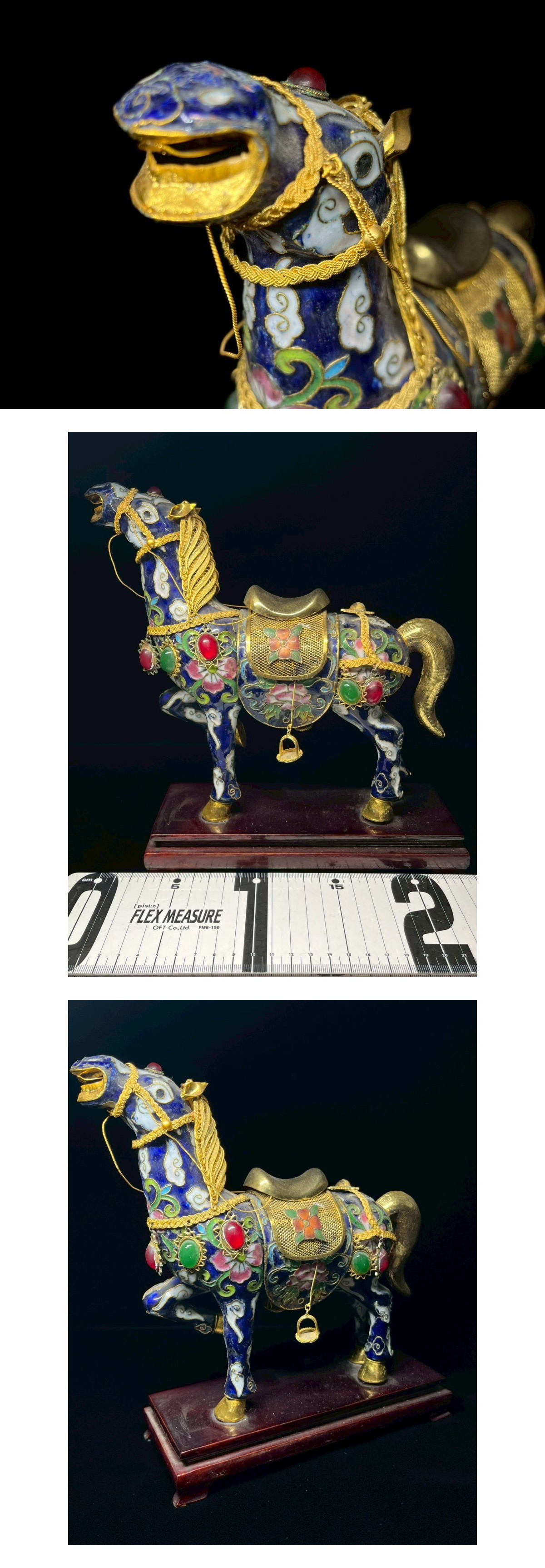 ●最高峰 豪華 景泰藍 七宝焼 唐馬像 細工 色石装飾 中国美術 古玩 骨董 縁起物 開運 彫金 時代物 オブジェ 木台付 飾物 伝統工芸 ■サイズ:横幅 23cm/縦幅 8.5cm/高さ 24cm ※素人寸法の為、若干の誤差はご了承ください。 ■状態につきましては経年に伴うスレ・汚れ・小キズ などが見られます。 ※その他の細かな状態は写真にてご確認・ご了承の上 ご入札くださいませ。 ●こちらの商品などは時代物や古いお品・骨董品となり ますので、細かな状態を気にされる方・神経質な方の ご入札はご遠慮くださいませ。 |