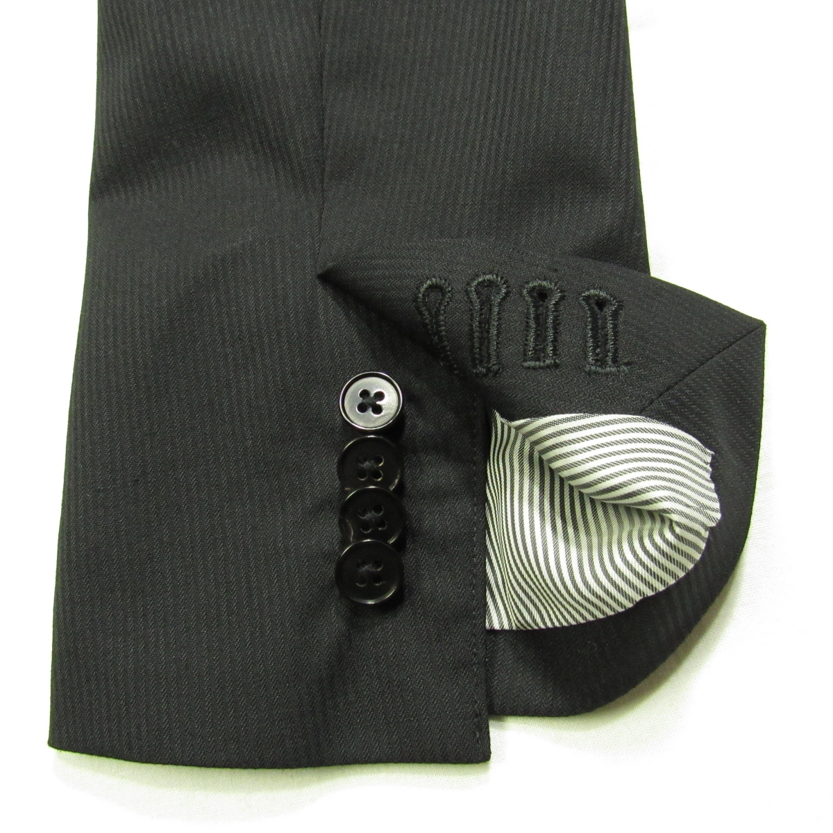 | ブラックシャドーストライプのスーツです。 季節はスリーシーズン対応だと思います。 メンズスーツ/秋~春 型番:0130291 【ジャケット】シングル2つボタン/サイドベンツ/裏地-総裏/台場仕立て/肩パッドはなしで薄い芯地のみ入り/袖口本切羽4つキスボタン 【パンツ】ノータック/裾シングル |