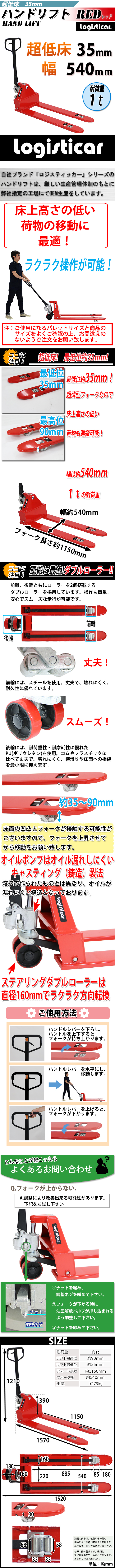 | 商品名 | 送料無料 ハンドパレット 超低床 35mm 幅540mm フォーク長さ1150mm 1000kg 赤 ハンドリフト ハンドパレットトラック ハンドリフター 1t 低床 パレットトラック リフト ハンドトラック ダブルローラー レッド RED lowred5401thj |