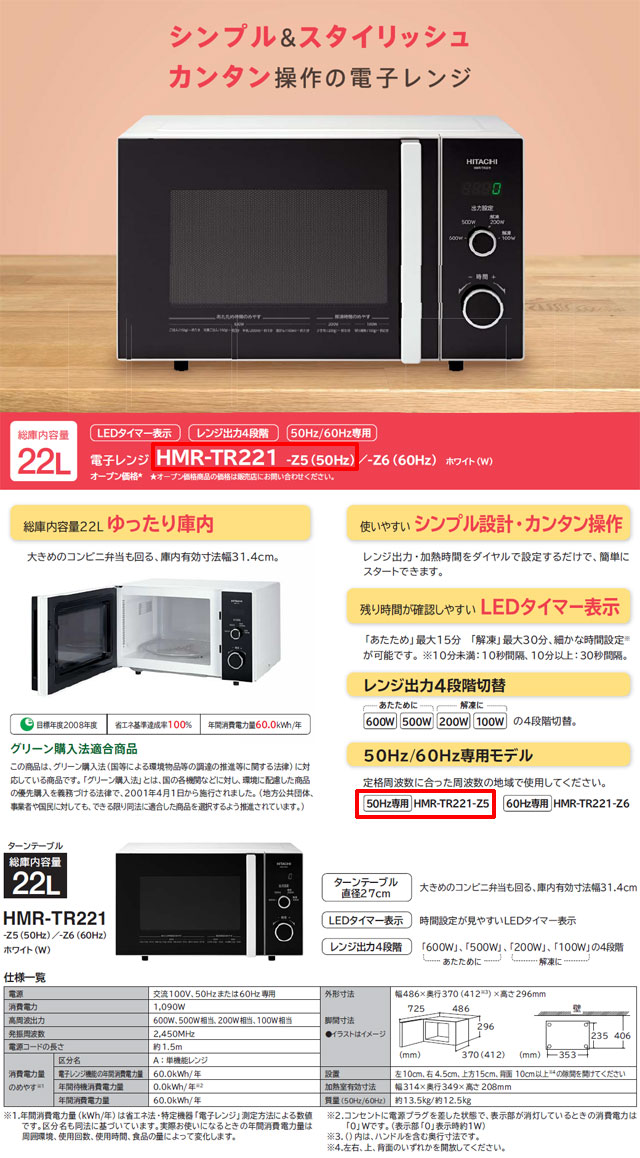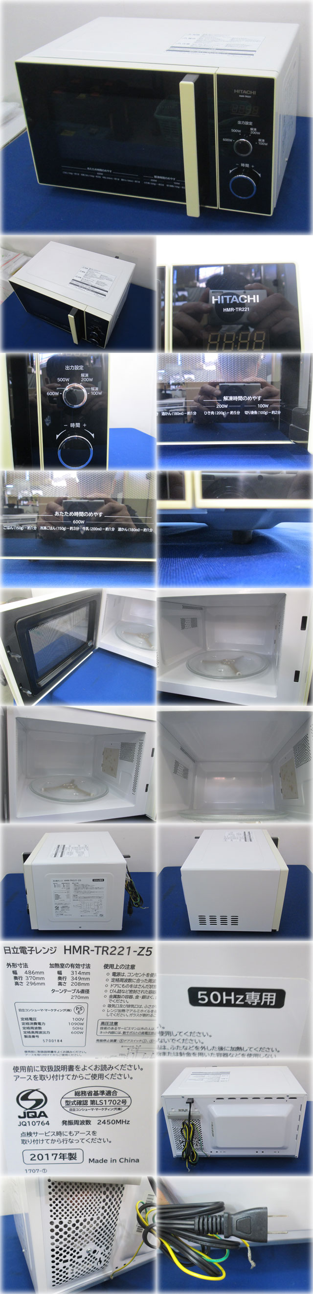 日立 電子レンジ HMR-TR221-Z5(W) を出品いたします。 ■特徴■ 総庫内容量22Lゆったり庫内 大きめのコンビニ弁当も回る、 庫内有効寸法幅31.4cm。 使いやすいシンプル設計・カンタン操作 レンジ出力・加熱時間をダイヤルで設定するだけで、 簡単にスタートできます。 残り時間が確認しやすいLEDタイマー表示 「あたため」最大15分 「解凍」最大30分、 細かな時間設定※が可能です。 ※10分未満:10秒間隔、10分以上:30秒間隔。 レンジ出力4段階切替 [あたために] 600W、500W [解凍に] 200W、100Wの4段階切替。 ■仕様■