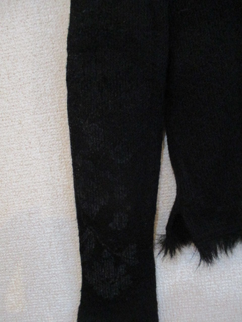 | 商品紹介 | 黒の長袖ニットです。 襟と裾はフリンジのようになっています。 両袖上側にフロッキープリントが入っていて、 デザインのポイントになっています。 薄手でやや透け感があります。 《素材》 アクリル56% ナイロン30% 毛14% |