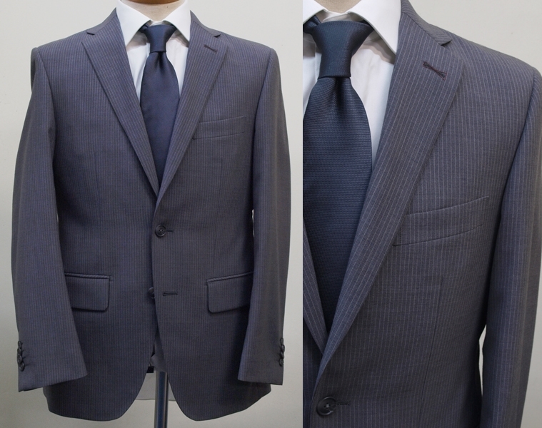 【サイズ】 A5 (AM号相当) 目安の体型 身長165cm~175cm、ウエストサイズ80cm前後 【ジャケット実寸】 肩幅45.5cm 着丈70cm 袖丈61.5cm 脇下部分50cm 身幅45cm 【パンツ実寸】 ウエスト(胴回り実寸)80cm わたり幅32cm(股下10cmの部位で29cm) 裾幅21cm 脇股上24.5cm 前股上26.5cm 股下88cm(裾上げしていない状態/新品) 【素材】 表地:ウール60% ポリエステル40% 裏地:胴裏/ポリエステル100% 袖裏/ポリエステル100% 真夏向けほど透け感があり薄手ではないですが、ほどよいハリがある紳士スーツ用、春夏向けウールブレンド素材を使用 【色】 明るめのミディアムグレー 【柄】 オフホワイトのラインでストライプ柄 【デザイン】 ・ジャケットはほどよいゆとりをもたせたシングル2つボタンでレギュラータイプ ・パンツは股上は浅くなくウエストラインで履くタイプのすっ きりシルエットのワンタックスラックスです。 春~夏~秋にかけて春夏メインのシーズン対応商品 【縫製仕様】 ・ジャケットはシングル2つボタン、ノッチドラペル、袖口ボタン4つ、センターベント、内ポケット4つ(小ポケット2つ含む)、背抜き(春夏物) ・パンツはワンタック、膝裏当て付き、脇ポケット斜めけ、後ろポケット両玉縁で左のみボタン付き、フロントはファスナーでホック仕様/うちかけボタンあり、シロセット加工 きちんとしたビジネス仕様の縫製仕立てで仕上がっております。