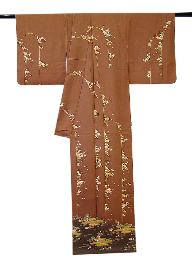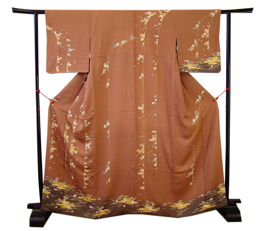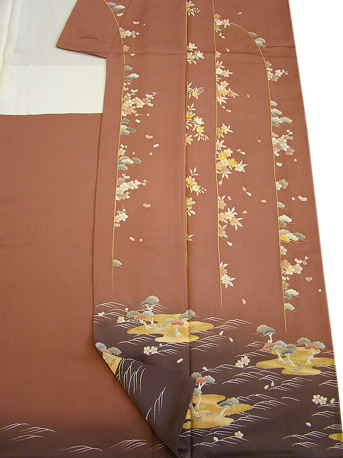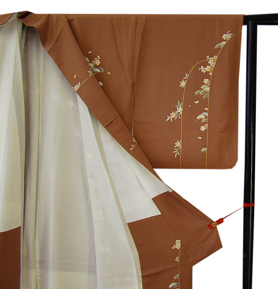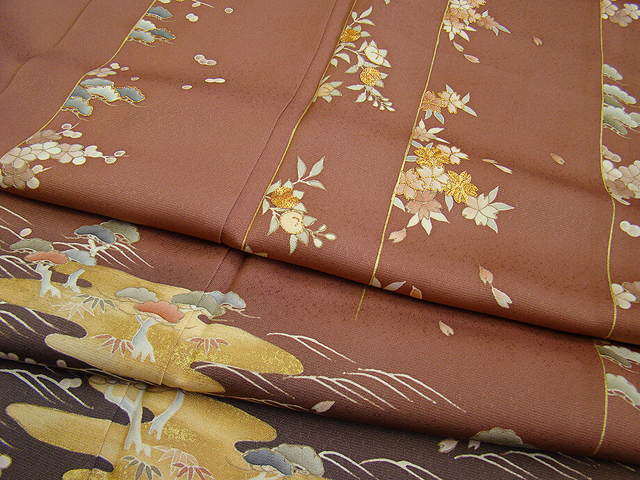| 商品説明 | こちらのお品は「袷」でございますので、10月~5月までお召頂ければと思います。 とてもしなやかで柔らかな手触りの着心地良い滑らかな重めの極上一越地の生地、 渋い蘇芳香色地に裾にかけて赤墨色ぼかし染に松竹梅や四季の花木柄等の 本加工染に金彩加工染に金糸入り、 八掛は共布に柄入り(正絹)、幅広い年代の方にお召頂けます。 |
