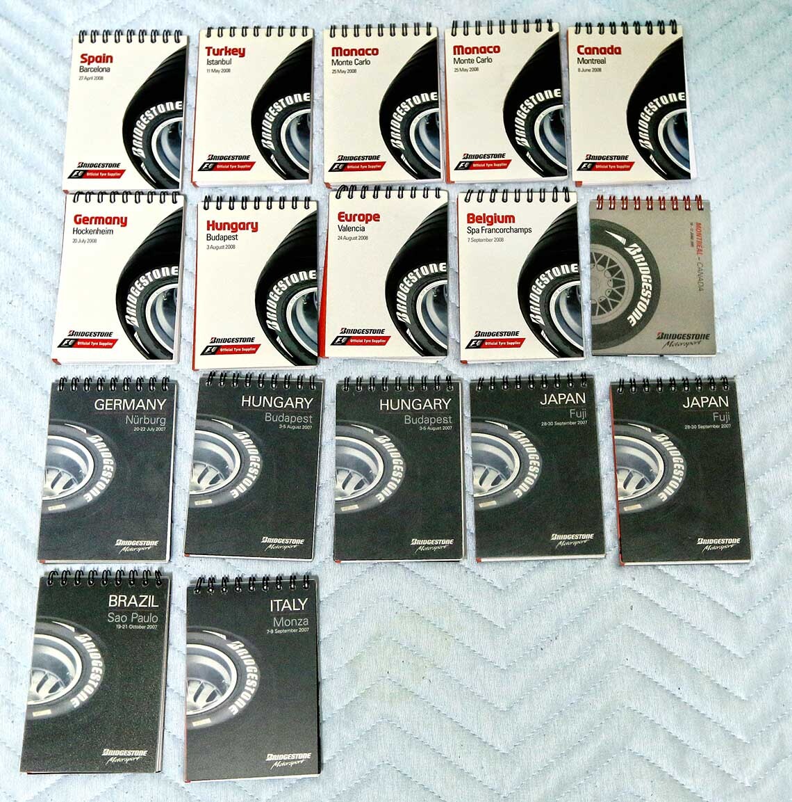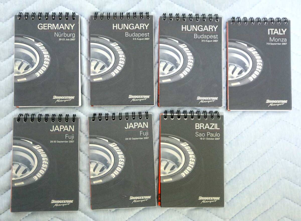 F1に参戦していたブリヂストンがグランプリごとにプレス関係者に配っていたデータ付メモ帳です。2005年はカナダ、2007年はドイツ、ハンガリー(X2)、イタリア、日本(x2)、ブラジル、2008年はスペイン、ドイツ、ヨーロッパ、トルコ、モナコ(X2)、カナダ、ハンガリー、ベルギー、合計で17冊です。中は各GPのコースレイアウト、スケジュールやドライバー情報などのデータと、メモ帳部分です。どれもおおむね11.5㎝x8㎝です。特に目立つ汚れもなく状態は良い方だと思います。15年以上前のアイテムで自宅保管品になりますことをご理解の上、ノークレームノーリターンでお願いします。サイズ60で発送できます