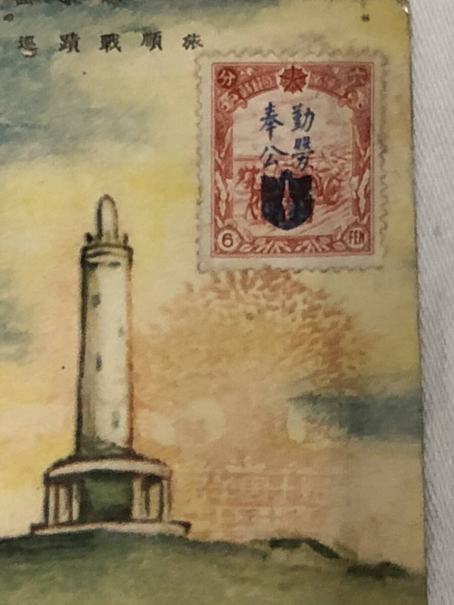 | 古絵葉書『旅順戦跡巡拝記念』満洲切手1枚貼付(国民勤労奉公法6分)/スタンプ押印あり/痛みあり/レトロ/中国 | ||