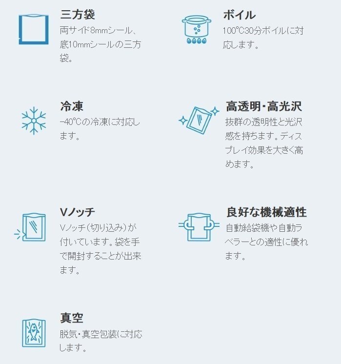 | 【 ここがポイント 】 ★厚み80μ(ミクロン)、温度帯を選ばず誰でも簡単に使えます。美しい光沢感、優れた透明性、しなやかな柔軟性、製法由来の内面衛生性を持った製品です! ★-40℃冷凍から100℃で30分ボイルまで一枚で対応し、独自技術の低カールは自動給袋適性良好です♪ ★丈夫な五層構造で両サイドと底部分をシールした三方袋。五層ながら、高い透明度と光沢感で中の商品を引き立てます。パック後の開封時はVノッチ(切り込み)が付いていて、袋を手で開封できます。 ★脱気・真空包装に対応します。柔らかな内容物も潰さず食感と風味を逃さず包みます。業務用としてテイクアウトの食品にお勧め♪お店自慢の味を自宅で楽しめます。ご家庭ではお一人様用に小分けして保存が可能です。