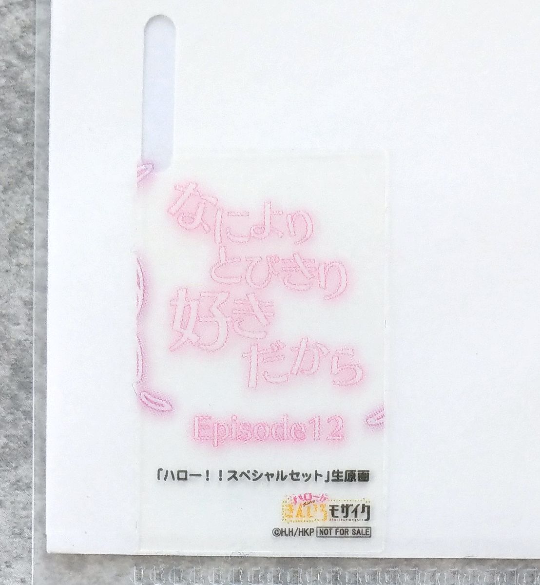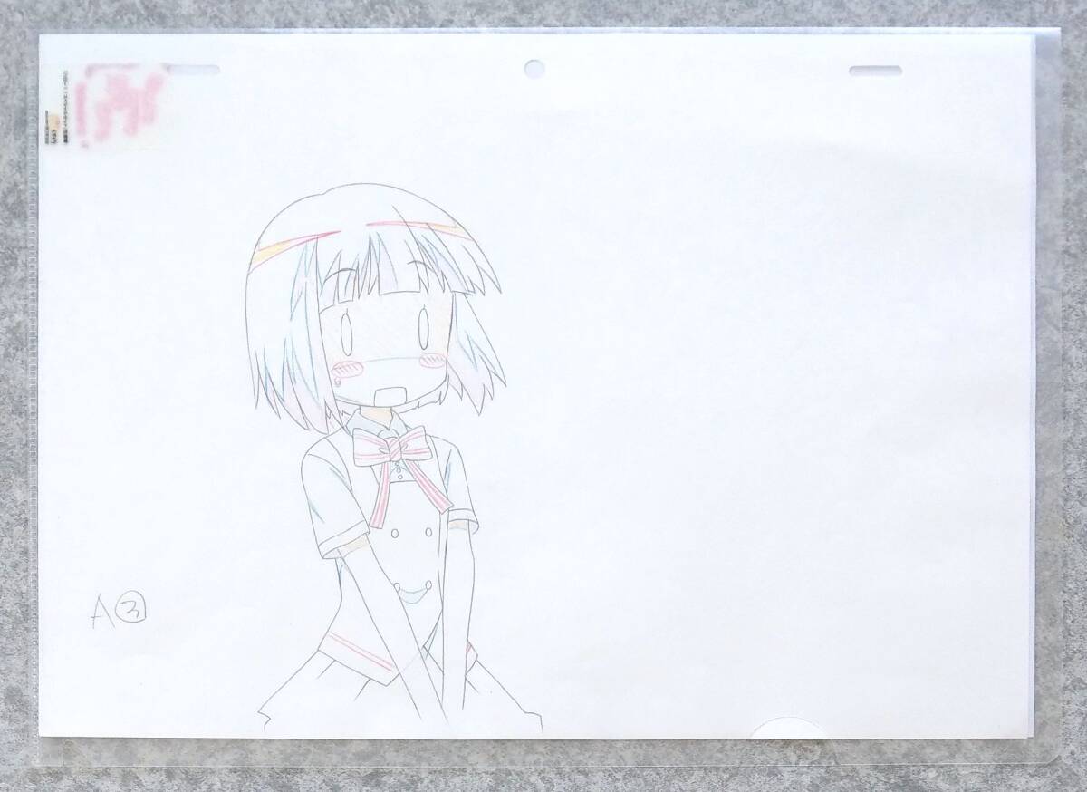 生原画、専用クリアファイル、送付のご案内ペーパーのセットです。アニメ制作現場で実際に使用された生原画です。クリアファイルに少し傷み、擦れがございます。