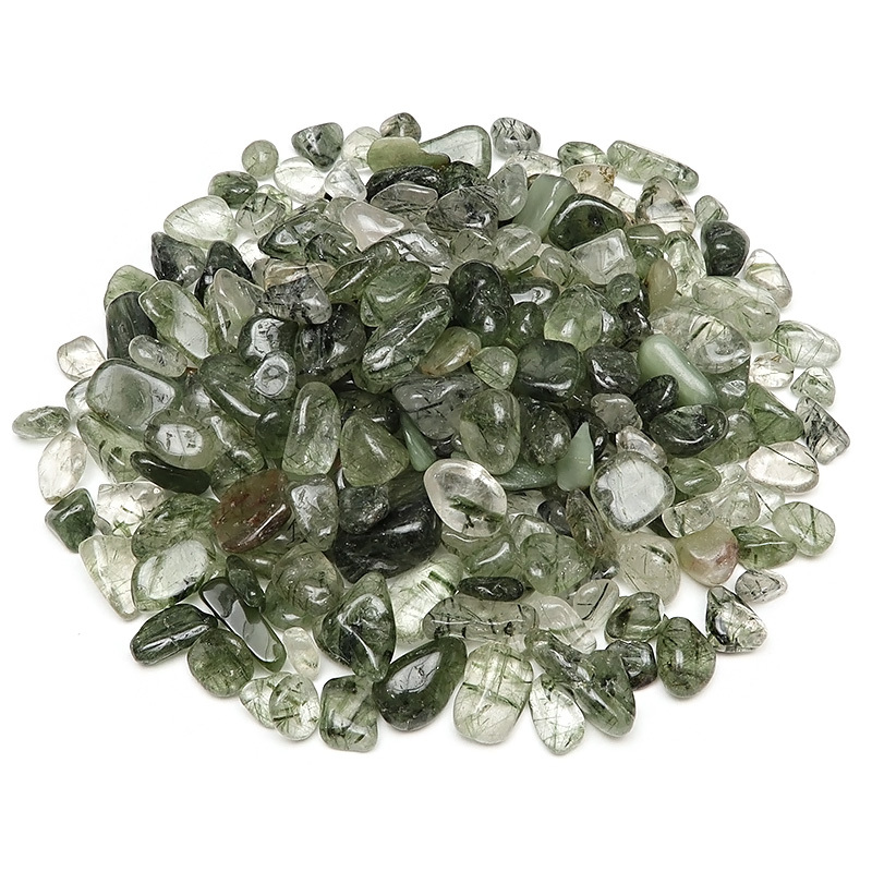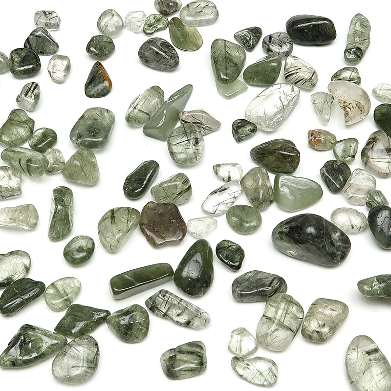 クォーツに浮かぶグリーンの針が印象的なアクチノライトクォーツの穴なしチップ(さざれ)です。