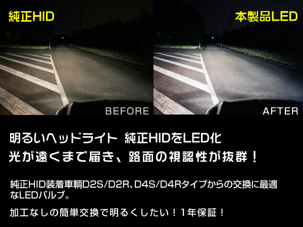 | 商品説明 | 純正が暗くてお悩みの方におすすめ 純正D1バルブが暗いと感じるユーザー様に更なる明るさ(視認性)を実現!! 視認性の大幅なUPで運転もスムーズに、抜群明るさで同じ車種に差を付けれること間違いなし!! HIDのバラストから電源を取得してLEDを点灯させる新技術! 接続アダパターをHIDバラストにつなげるだけ! バルブ交換の要領でLED化できます。純正HIDの2倍の明るさを実現! 純正HIDを加工不要で簡単LED化! バラストからドライバー(コンバータ)へ交換不要 ! 加工は不要なので、バルブ交換だけで、純正HIDを簡単に! 車検にも対応しているので、安心して交換できます。 ※一部車種でヘッドライトユニットやバンパーの脱着が必要な場合もございます。 ※ヘッドライトユニット内にスペースがない場合、装着できない場合ございます。 ※非常に強い発光をしますので、お取付の際は、直視なさらないようにご注意下さい。 |
