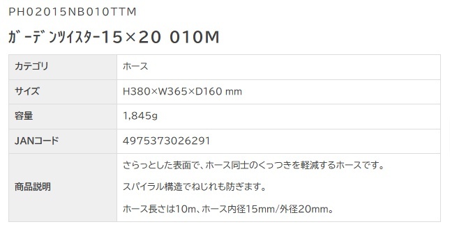 タカギ TAKAGIガーデンツイスター15x20 010MPH02015NB010TTM■商品説明・さらっとした表面で、ホース同士のくっつきを軽減するホースです。・スパイラル構造でねじれも防ぎます。・ホース長さは10m、ホース内径15mm/外径20mm。■サイズ・H380×W365×D160 mm■容量・1,845g