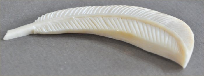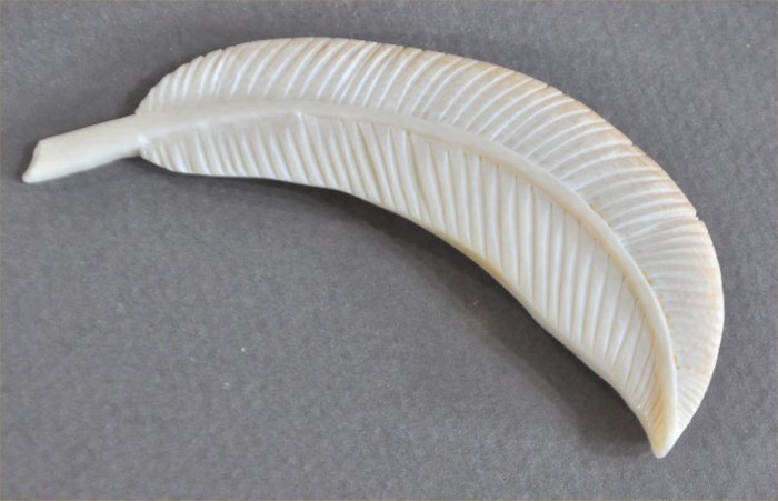 フェザーデザインオーナメントNO1サイズは、87mm×40mm厚み14mm磨き仕上げ素材マンモス牙裏側を逆テーパーに彫ってあるので少し浮いている感じになっています。
