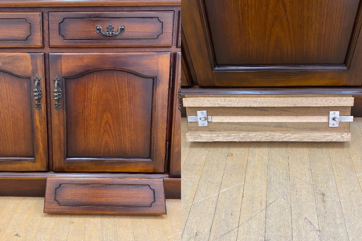 こちらはカリモク家具の両面食器棚です。 中古品です。 【karimoku カリモク家具】 カリモク家具は1940年に愛知県刈谷市で創業した国内製造家具メーカーです。 「100歳の木を使うなら、その年輪にふさわしい家具を作りたい」との思いで家具づくりを行っている、 日本で最もスタンダードな家具メーカーのひとつです。 人気のコロニアルシリーズより両面使いできる食器棚のご紹介です。 アメリカの開拓時代を彷彿とさせるカリモクの「コロニアル」シリーズは、 1974年に発表したトータルコーディネートのできる家具シリーズとして多くの方に愛されています。 こちらの食器棚は、両面に加えサイドの1面からも使用できる珍しい3面タイプの食器棚です。 上下が分離するタイプで、上段は格子窓のガラス扉とガラスの引戸、下段は引き出しと木製の開き扉となっています。 上段と下段はダボと2箇所の連結ネジで固定する仕様です。引出しは片面が飾りで引き出すことはできませんが、 取り外しできるため、使い勝手に合わせて付け替えできます。 格子や取っ手の装飾など、細部にわたり美しい装飾が施され優雅なひとときを演出してくれる一品です。 キッチンとダイニングの境界に置いて、空間を間仕切るように使うのがおすすめです。 ガラス扉が多くサイズの割に圧迫感も少ないかと思います。見せる収納で楽しめる魅力的な食器棚です。 【コンディションについて】 全体に経年や使用によるキズや塗装落ち、木部の剥がれなどがあります。 下段の収納部分の扉が完全に閉まらない箇所があります。正面からの画像3枚目、右側の収納です。 こちらの箇所は木部の剥がれもあります。一見するとあまり目立ちませんので、外観上それほど気にならないかと思います。 隙間の具合などは以下の追加画像をご覧ください。ガラス戸のレールに割れ・欠けがあります。 使用感はありますが、つくりの良いしっかりとしたお品で、永くご愛用いただける家具となっています。 食器棚を中心としたコロニアルスタイルの空間づくりにいかがでしょうか。 他詳細については下記画像も併せてご参照ください。 ![]() ![]() ![]() ![]() ![]() ノスタルジックな雰囲気を漂わせる優雅な一品となっています。 この機会に是非ご検討ください。皆様のご入札お待ちしております。 再良市場の他のお品物はこちらから!