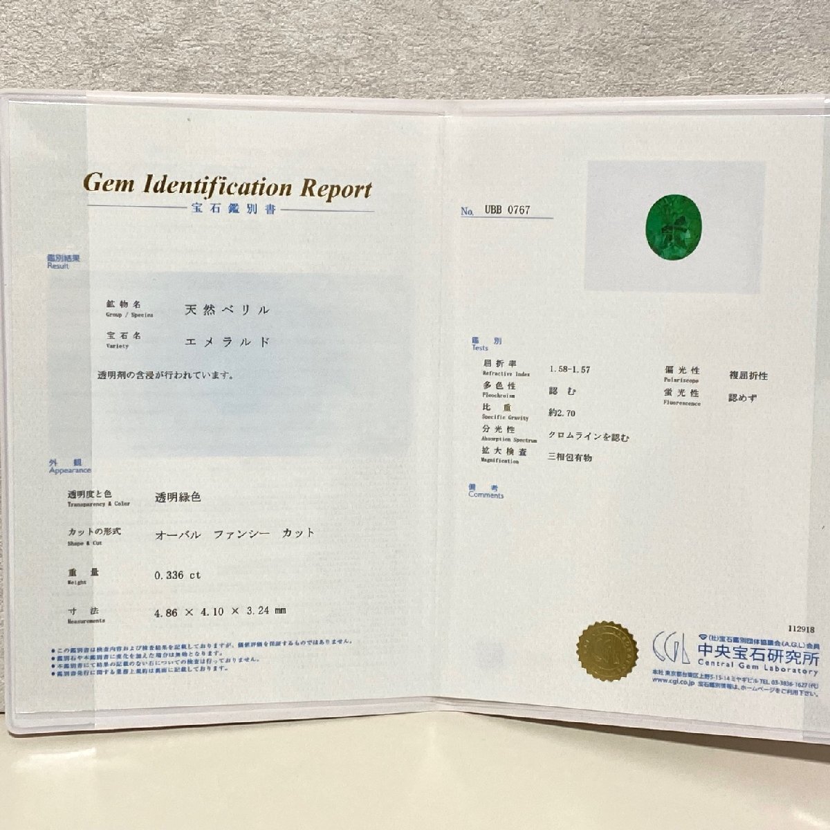 ☆【KJC】K18WG 留め具部SV(シルバー) エメラルド 0.336ct/ダイヤモンド 0.04ct ネックペンダント 中央宝石研究所鑑定書付き | ||