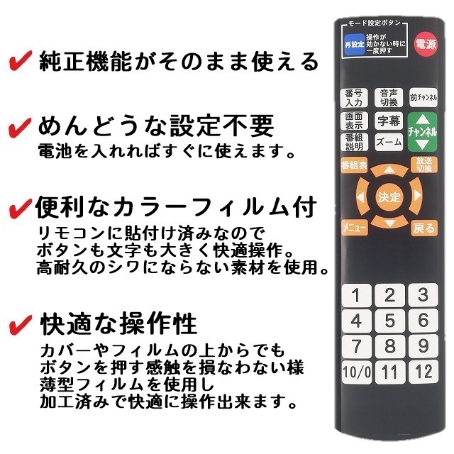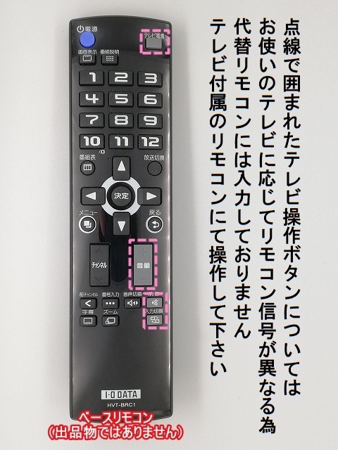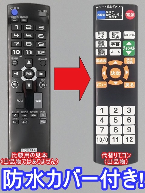 | 【商品名】 I.O DATA HVT-BRC1 代替リモコン 【対応機種】 HVT-BTL 上記機種以外については、質問欄よりメーカーと型番をご連絡頂ければ、対応品のご案内をしております。 【商品について】 右側の代替リモコンが出品物になります。左側のリモコンは見本画像です。 タイトル機種のリモコン信号を入力した、設定不要で使える純正品と同等の代替リモコンです。 テレビ操作用のボタン(TV電源/音量/消音/入力切換)については環境に応じて異なるため、 代替リモコンには入力しておりませんので、お使いのテレビリモコンで操作してください。 商品に不具合があった場合は代替品交換かご返金にて対応させて頂きます。 【付属品について】 防水リモコンカバーをお付けします。 ボタン機能を印刷した薄型フィルムはリモコンに貼付け済みです。 乾電池は付属しません。別途ご用意下さい。(単4乾電池×2本) 【発送について】送料無料 迅速発送を心掛けております。土日祝日はお時間を頂く場合ございます。 ポスト投函配達となり、日時指定は出来ません。 | ||