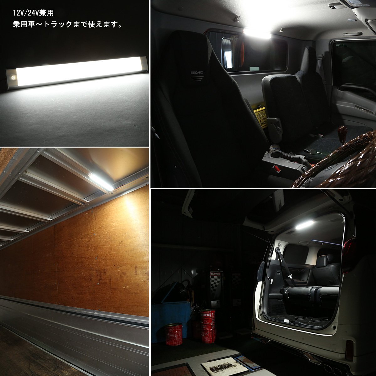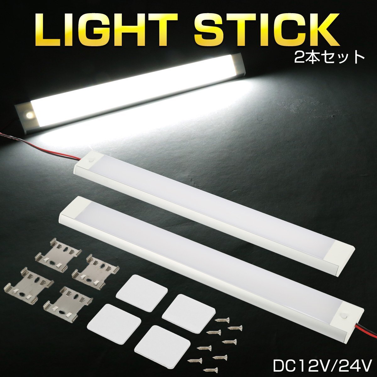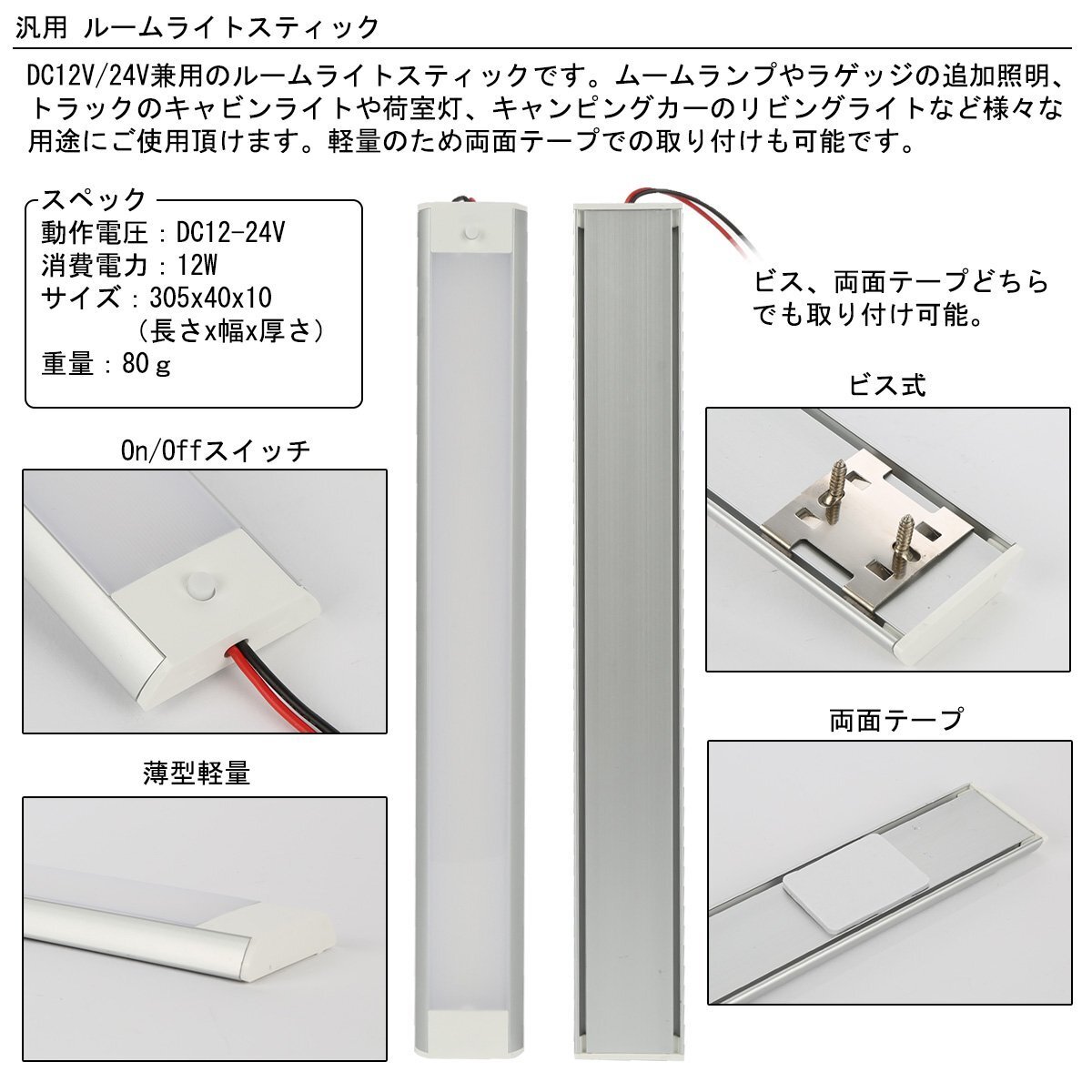 DC12V/24V兼用のLEDライトスティック。 ムームランプやラゲッジの追加照明、トラックのキャビンライトや荷室灯、キャンピングカーのリビングライトなどの様々な用途にご使用頂けます。 軽量のため、両面テープでの取り付けも可能です。 ・その他の後付けランプは⇒ こちら | ■ LEDライトスティック ■サイズ:長さ305mm×幅40mm×厚さ10mm ■ 動作電圧:DC12-24V ■ 消費電力:12W ■ 発光色:ホワイト ■ 入り数:2個 ※本品は防水ではありません。水濡れしない所に設置してください。 | |
