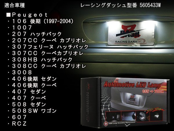 純正のライセンスランプをユニットごと交換する車種別専用設計品! カプラーオンで装着できLEDを可能な限り配置していますのでバルブ交換では実現できない高照度を実現! ワーニングキャンセラー内蔵のため、球切れ警告も防止します。 色温度も約7000Kの純白で愛車のリアビューをスタイリッシュに演出します。 お届け日より安心の3か月保証付きです。 その他、レーシングダッシュ製品は⇒ こちら | ■ レーシングダッシュ型番:5605433W ■ ワーニングキャンセラー内蔵 ■ 動作電圧:DC12V ■ 保証期間:到着日より3か月間 ■ 色温度:約7000K ■ 入数:2個セット 純正品と同様の結露の発生や少量の水滴の侵入、お客様の取り扱い上による破損及び加工改造等を行った物は保証対象外です。 保証はあくまで製品本体の保証であって、取付け工賃や製品使用から生じたいかなる損害に関しては当店は一切の責任は負いません。 | |