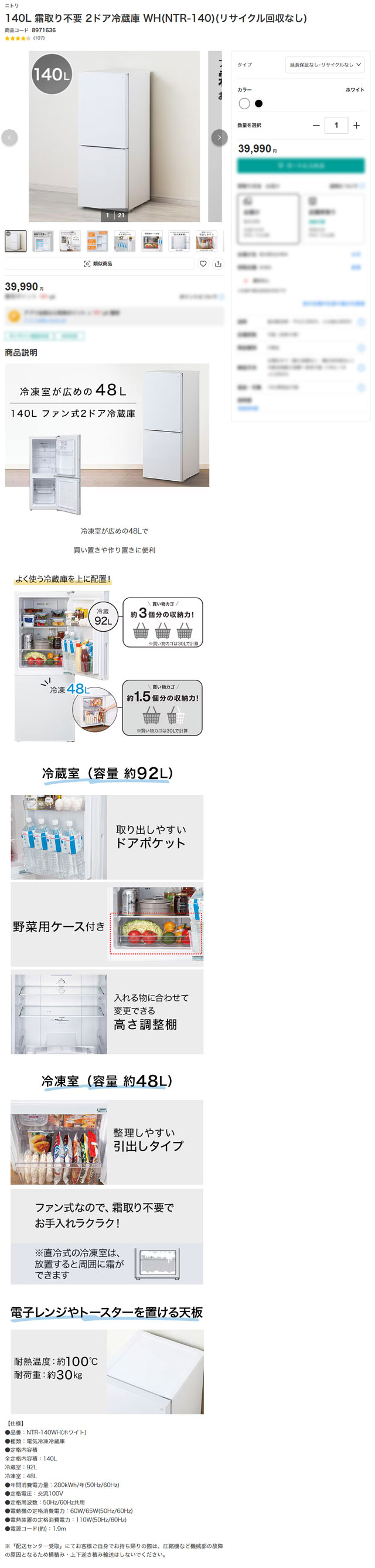 メーカー・型式 | ニトリ / NTR-140WH | |